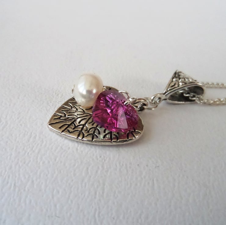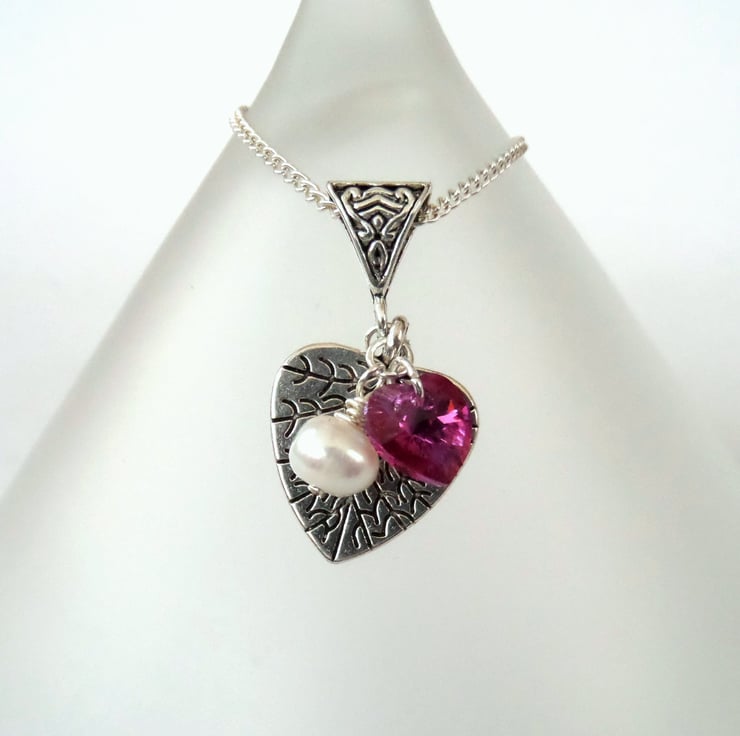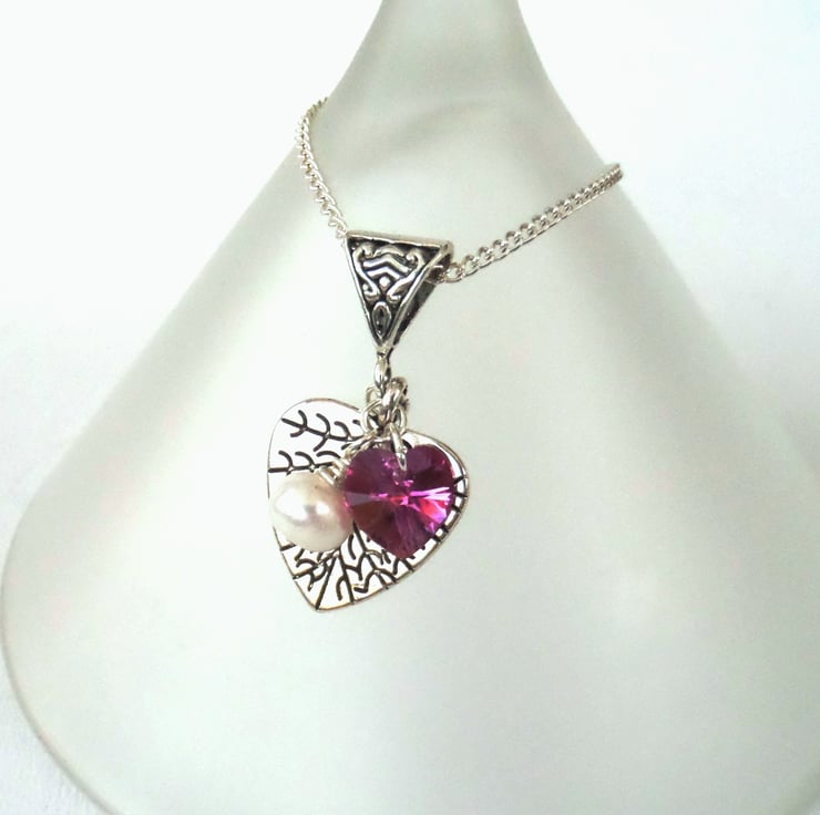 A simple but eye-catching handmade charm necklace, with stunning pink Swarovski crystal elements heart and a single white pearl.