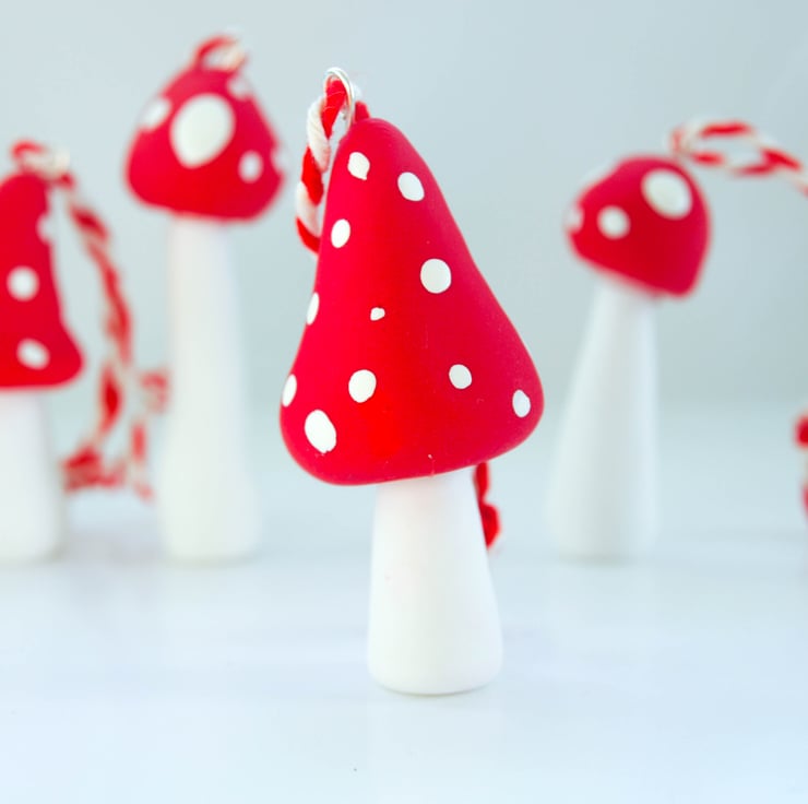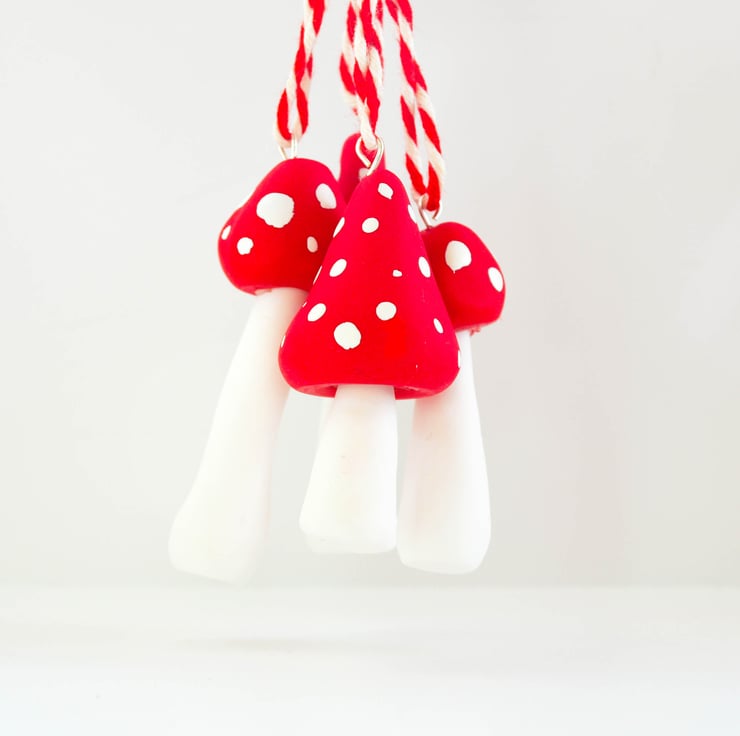 Cute little toadstool Christmas Decorations made with crimson red fimo, each one is hand moulded and baked in a hot oven, Once cooled they are glued and then painted with little white enamel spots, a silver hook is then added to the top and threaded with festive bakers twine!
