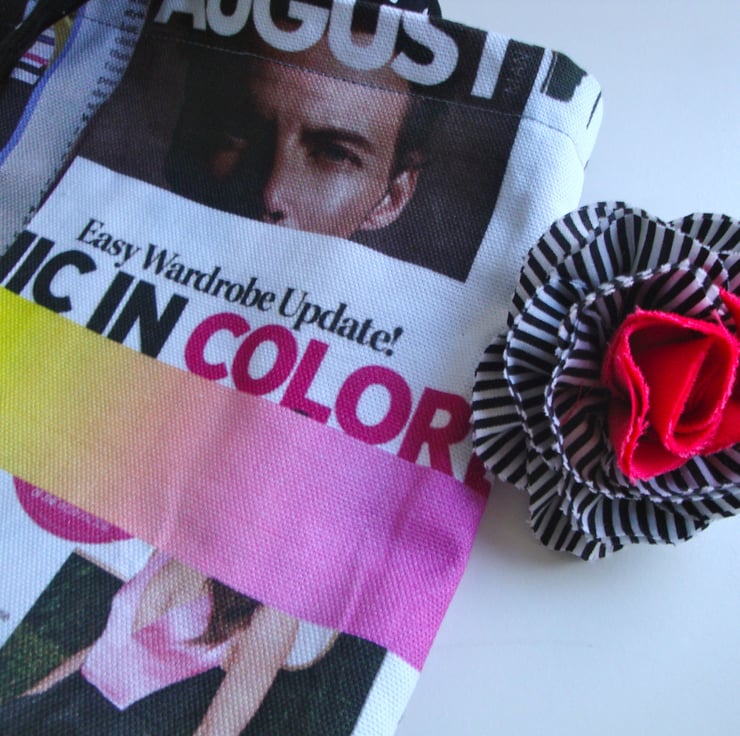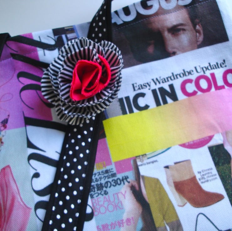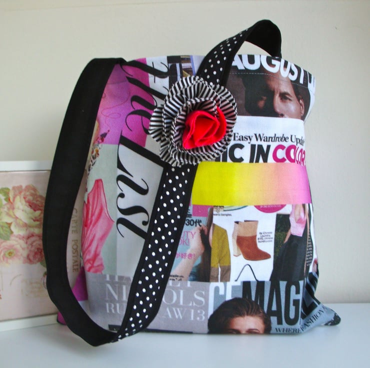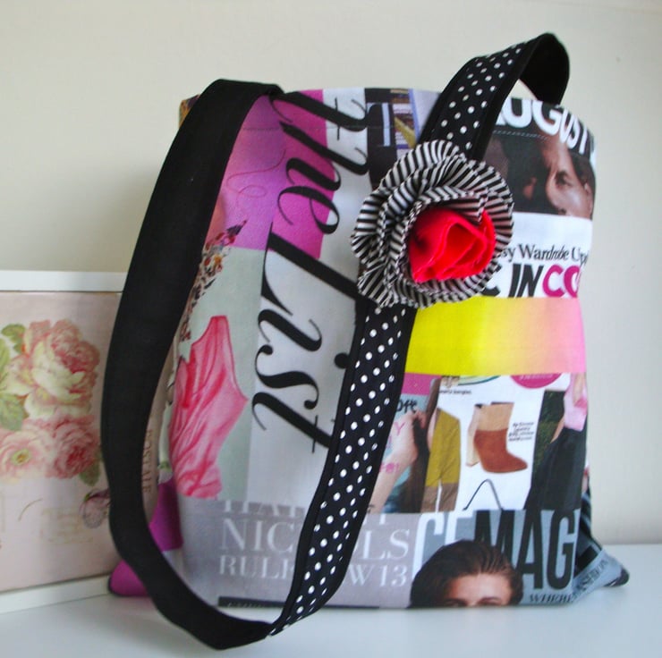 Made in a lovely printed cotton fabric , featuring magazine images . I have included a shabby chic flower , made in a white/black stripy cotton fabric ,and a plain rose pink cotton. (with a brooch pin on the back ) ...can be pinned on a jacket - scarf - hat .