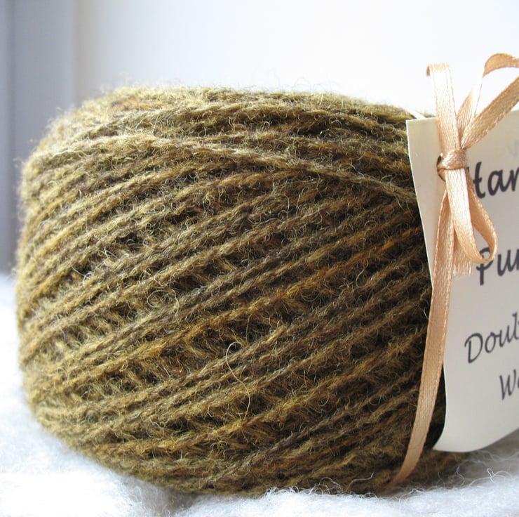 A blend of white and dark brown fleece in a 1 to 1 ratio overdyed Lichen. 100g ball, approx 280 metres (300 yards). Hand wash separately at low temperature. A joy to knit and very warm. If you would like a free sample card of all the colours in this range, please send a stamped addressed envelope to Tavistock Tastes and Textures, Tor Grove Farm, Rix Hill, Tavistock PL19 9EQ.