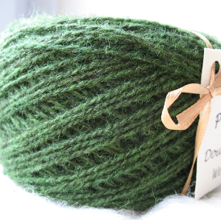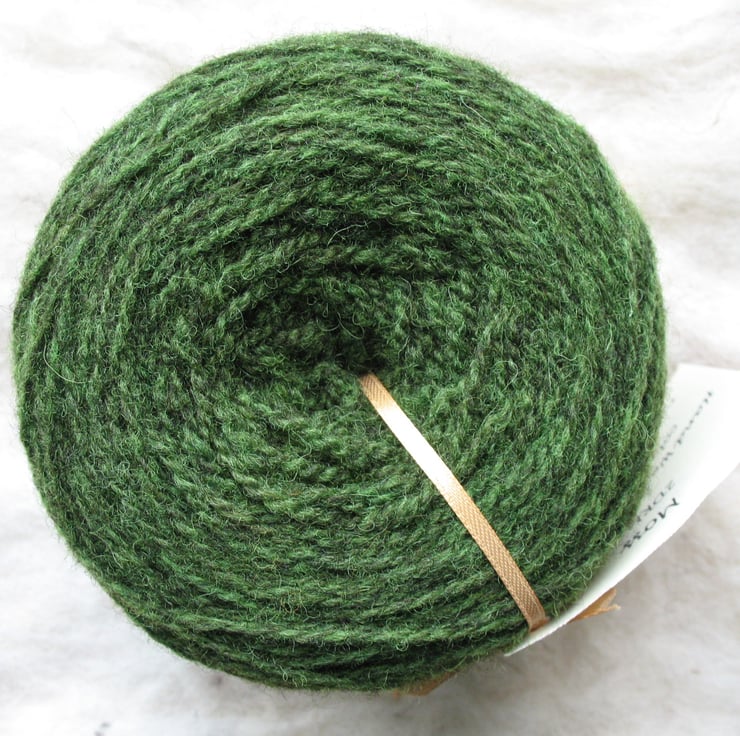 A blend of white and dark brown fleece in a 1 to 1 ratio overdyed Moss. 100g ball, approx 280 metres (300 yards). Hand wash separately at low temperature. A joy to knit and very warm. If you would like a free sample card of all the colours in this range, please send a stamped addressed envelope to Tavistock Tastes and Textures, Tor Grove Farm, Rix Hill, Tavistock PL19 9EQ.