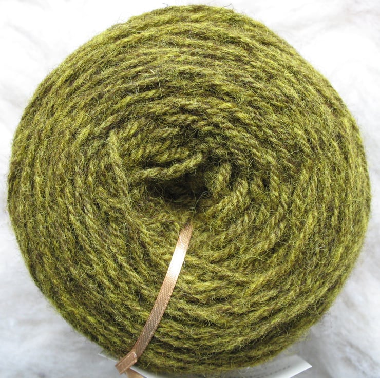 A blend of white and dark brown fleece in a 1 to 1 ratio overdyed Wattle. 100g ball, approx 200 metres. Hand wash separately at low temperature. A joy to knit and very warm. If you would like a free sample card of all the colours in this range, please send a stamped addressed envelope to Tavistock Tastes and Textures, Tor Grove Farm, Rix Hill, Tavistock PL19 9EQ.
