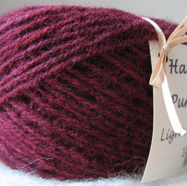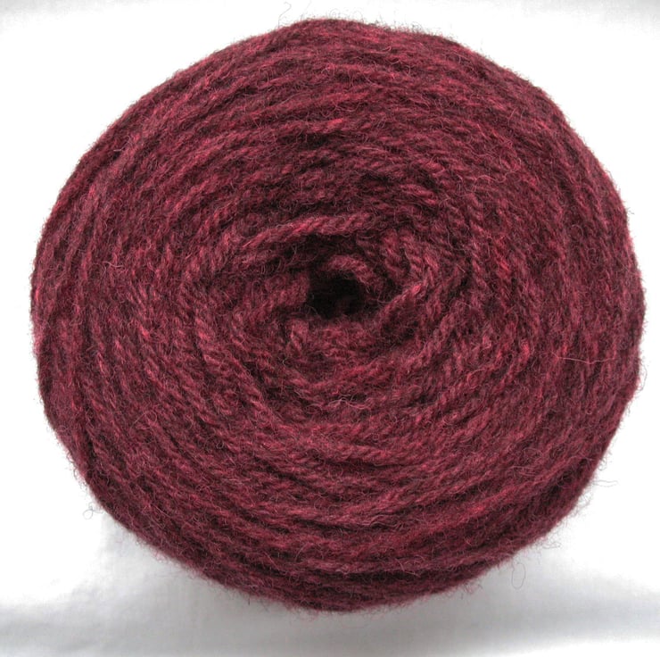 A blend of white and dark brown fleece in a 1 to 1 ratio overdyed Plum. 100g ball, approx 280 metres (300 yards). Hand wash separately at low temperature. A joy to knit and very warm. If you would like a free sample card of all the colours in this range, please send a stamped addressed envelope to Tavistock Tastes and Textures, Tor Grove Farm, Rix Hill, Tavistock PL19 9EQ.