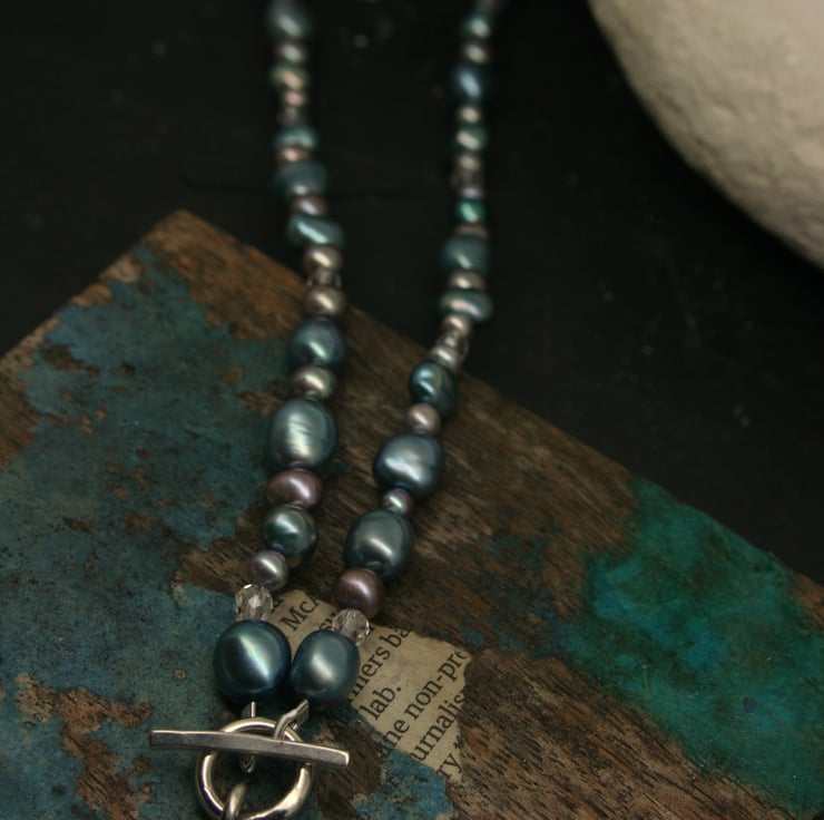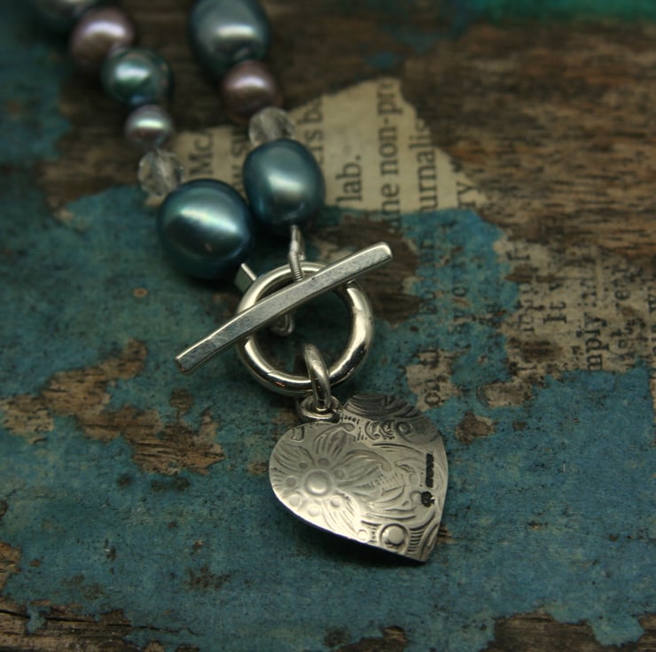Paisley imprinted heart pendant on blue mixed pearl necklace with t-bar catch. 17.5" long,