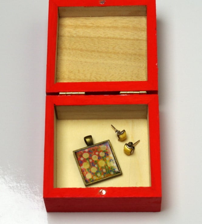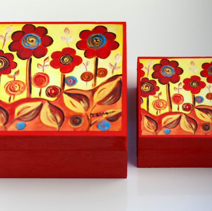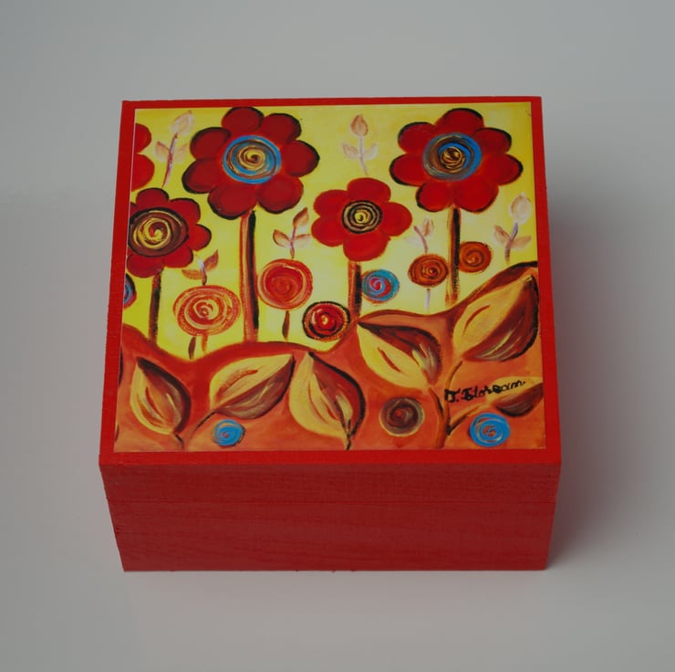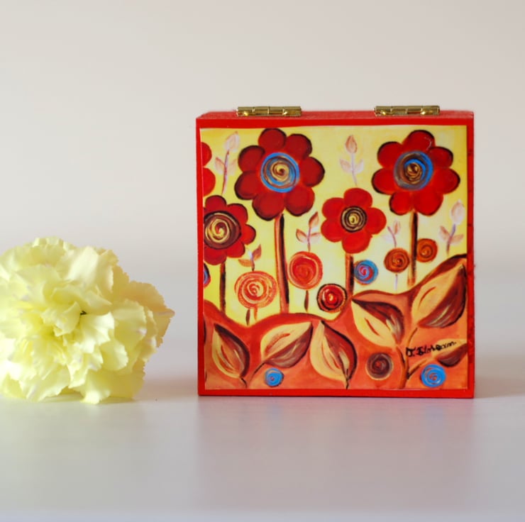 A wooden jewellery box hand painted by me using acrylic and and an art print on top after my original painting "Flowers Joy". The box is natural wood inside. The print is made on 270 GSM satin artist paper. The box measures 3.1" x 3.1" and 1.6" high. It can be used as jewellery box, storage box for small items and decorative box to complement your home décor. It is very popular as Christmas gift for girls of all ages. To be handled with care.