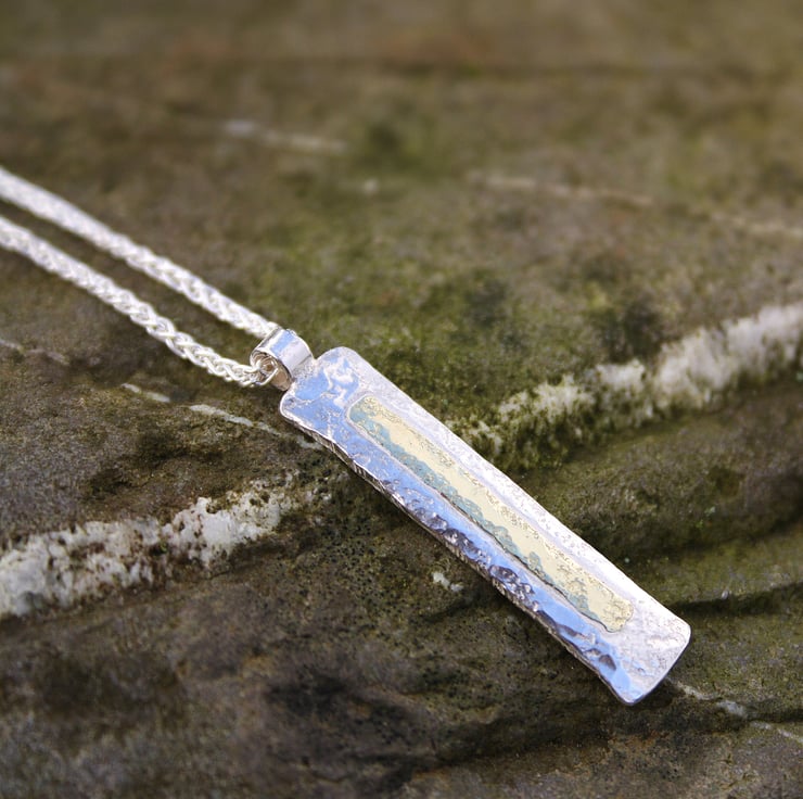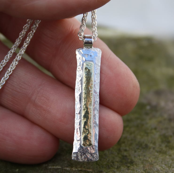 A hammered sterling silver and 18 ct gold rectangular pendant hung from an 18 inch sterling silver chain.