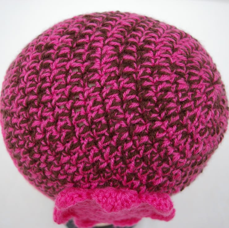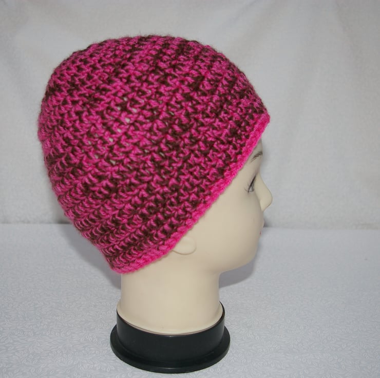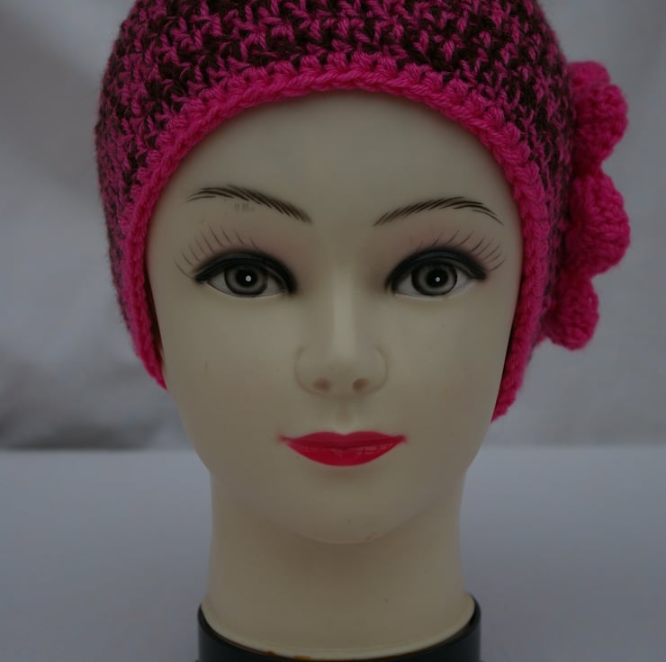 A ladies beanie hat hand crocheted in dark brown and bright pink. I have used a soft acrylic yarn of an aran weight. The hat has a lovely large bright pink crochet flower hand sewn to one side. The hat may be worn with the flower facing to the left or right side or at the front of the forehead. The hat has a bright pink border rim.