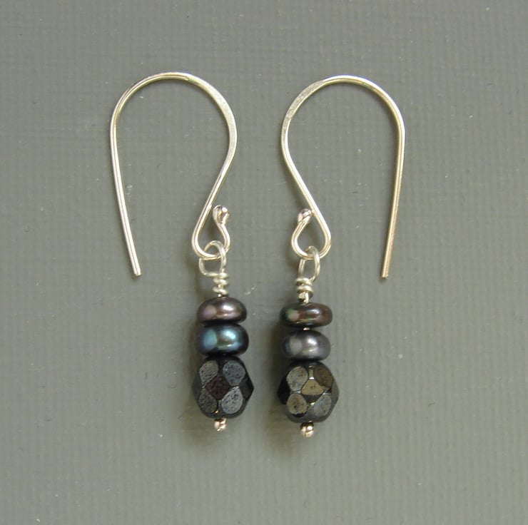 These luxe dangle earrings comprise three beads in each drop. A Czech glass crystal in hematite or gunmetal colour topped with two tiny button pearls, the June birthstone, in peacock grey. The pearls have a beautiful green iridescence to them. These earrings are mounted on sterling silver wires hand-made in my West Sussex workshop and measure a delicate 38 mm long.