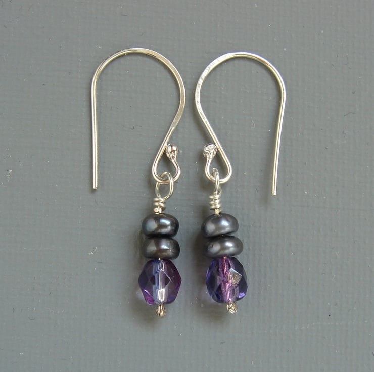 I love making these fun earrings in lots of different colours. The Czech crystals I use come in many shades and some have stunning glass effects like these which are a fusion of violet and lavender coloured glass. The pearls are a natural grey colour with peacock-like iridescence. Certainly NOT your grandmother's pearls.