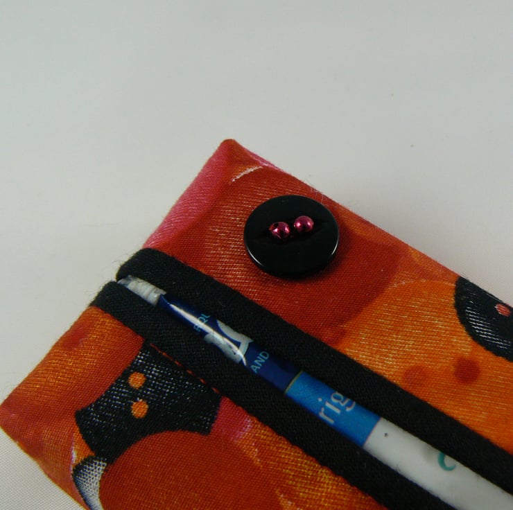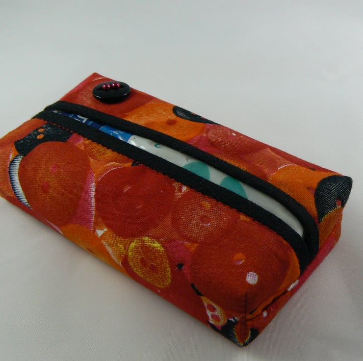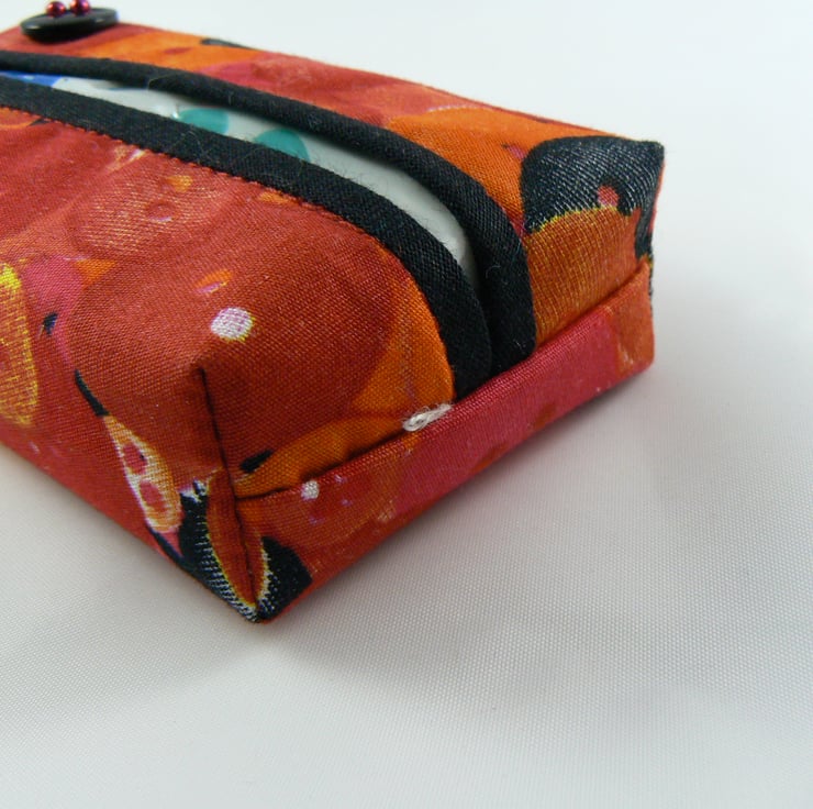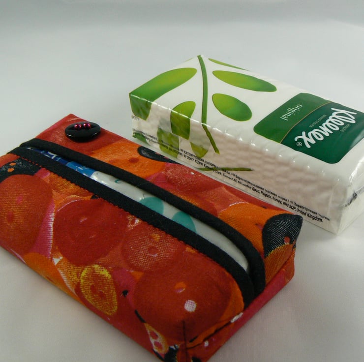 I have made this little pocket tissue holder from a lovely button print fabric in red ,orange, and black and edged opening in black to match, boxed the corners, then added a shiny black button and two red beads to finish.