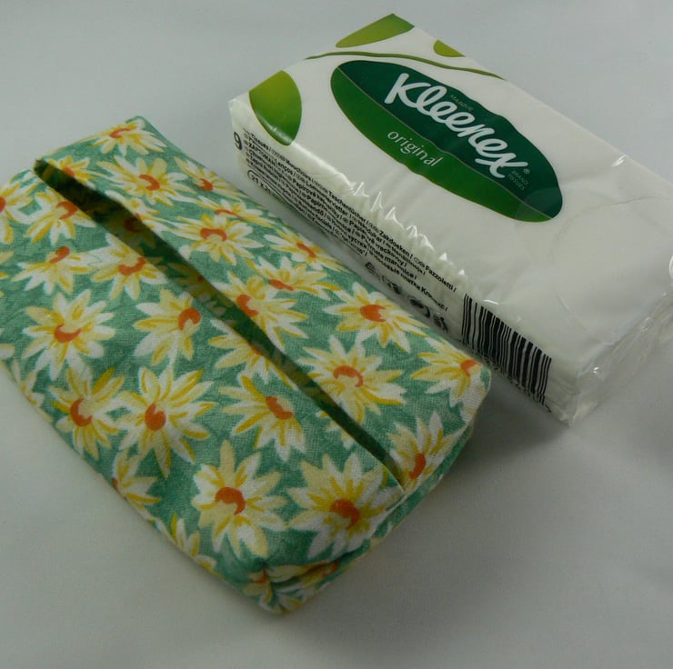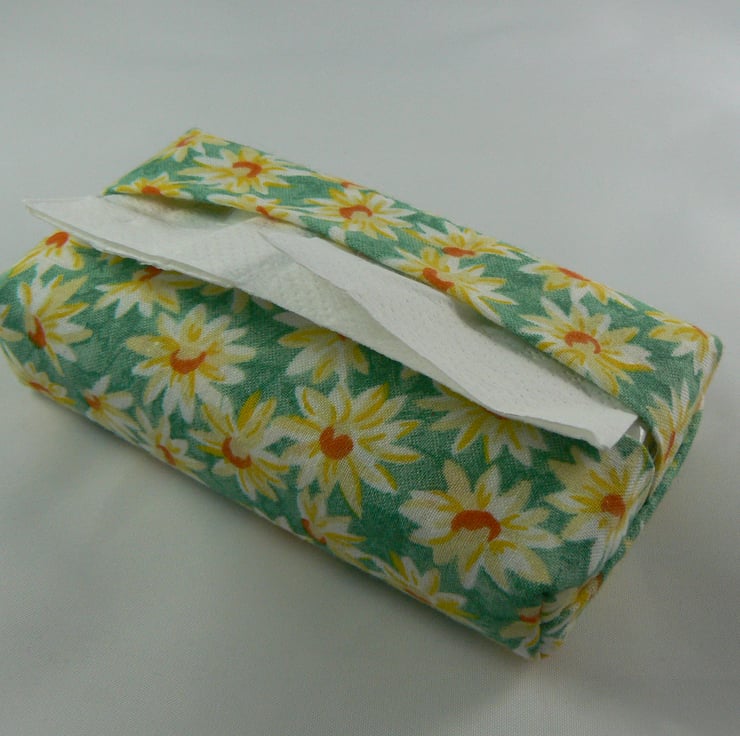 I have made this little pocket tissue holder from a daisy print cotton fabric .