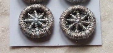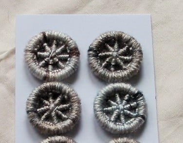 Silvery grey Dorset buttons, with little splashes of dark brown and kingfisher,