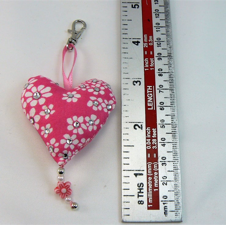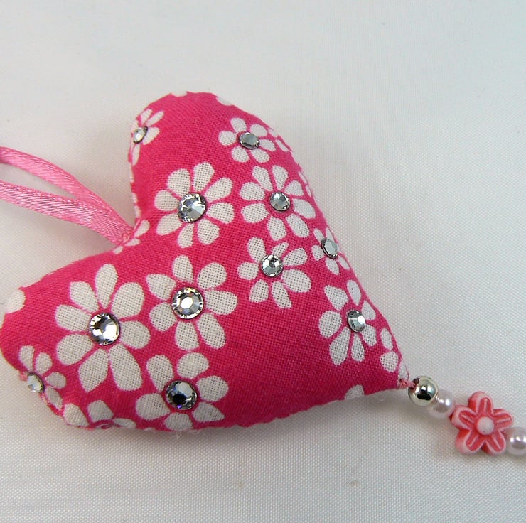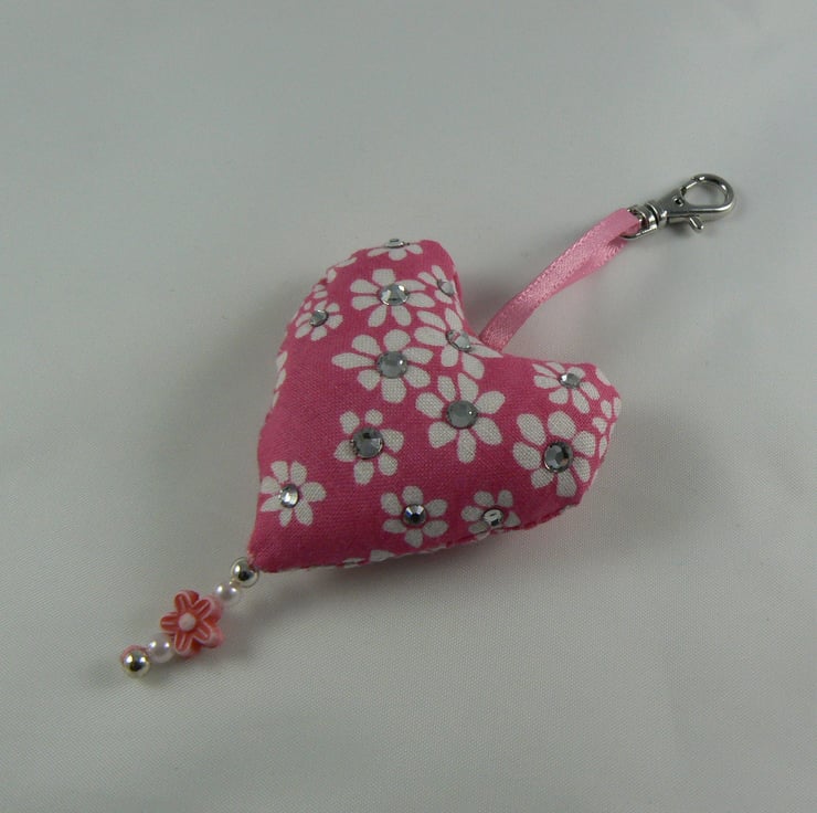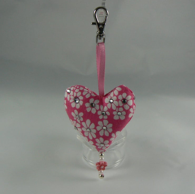I have made this little handbag charms from a pretty pink daisy print fabric and embellished it with genuine Swarovski crystals . This heart hangs form a little pink ribbon topped with a small lobster clasp and has two silver beads and two pearl coloured beads either side of a pink daisy bead dangling from the bottom.