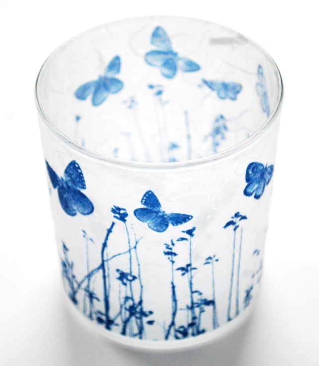 A beautifully translucent Cyanotype on mulberry paper makes this a very special candle holder. When the candle is lit the light flickers through the image bringing the blue butterflies alive.