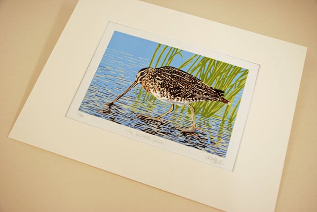'The Secretive Snipe' - Original, Limited Edition Hand Pulled Linocut Reduction Print. Image of Common Snipe in reed bed. Printed in 11 colours and pulled on hand press. Signed, numbered and titled in pencil by the artist.