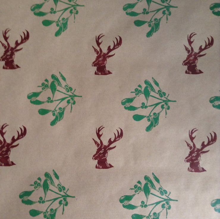 A beautiful gift wrap featuring a mistletoe and Stag combo design in Venetian Red and a lovely green ink on kraft paper. Hand printed in a random pattern, on a 50 cm x 70 cm sheet.