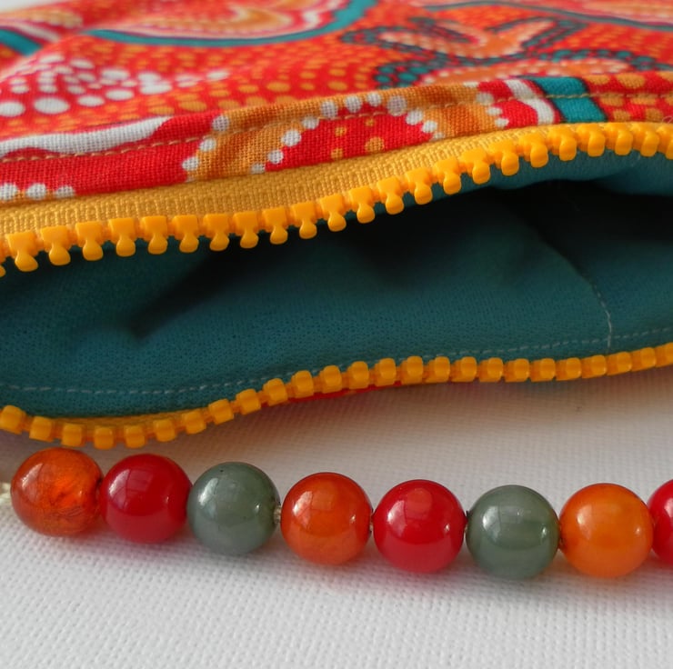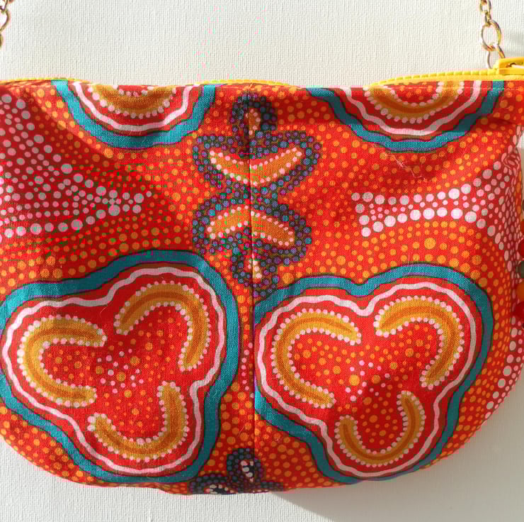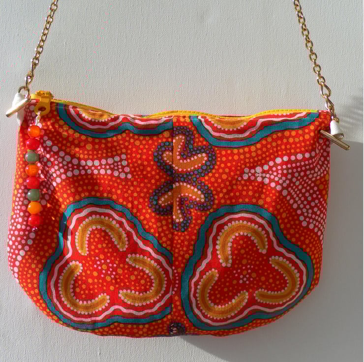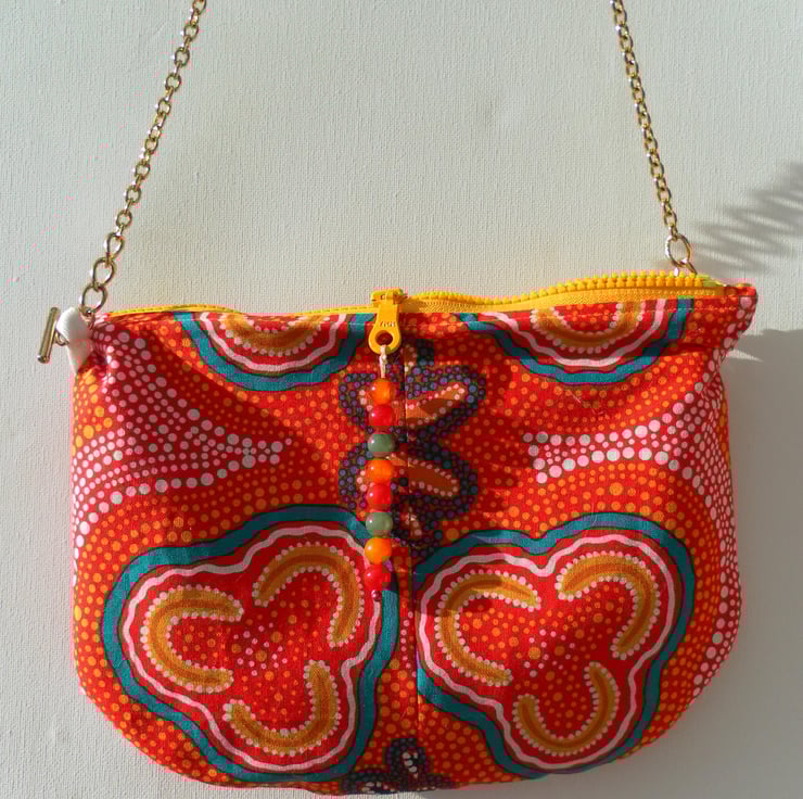 This unique, eye catching shoulder bag is made using a cotton fabric from Australia which features the design called “Meeting Places”, in shades of orange with turquoise, ochre and white. The bag is lightly padded and lined with a matching turquoise fabric and it has an internal pocket, perfect for a phone. The zip is bright yellow with colour coordinating beads on the zip pull. The handle is a repurposed chain approximately 88cm long and the bag is 19cm x 25cm.