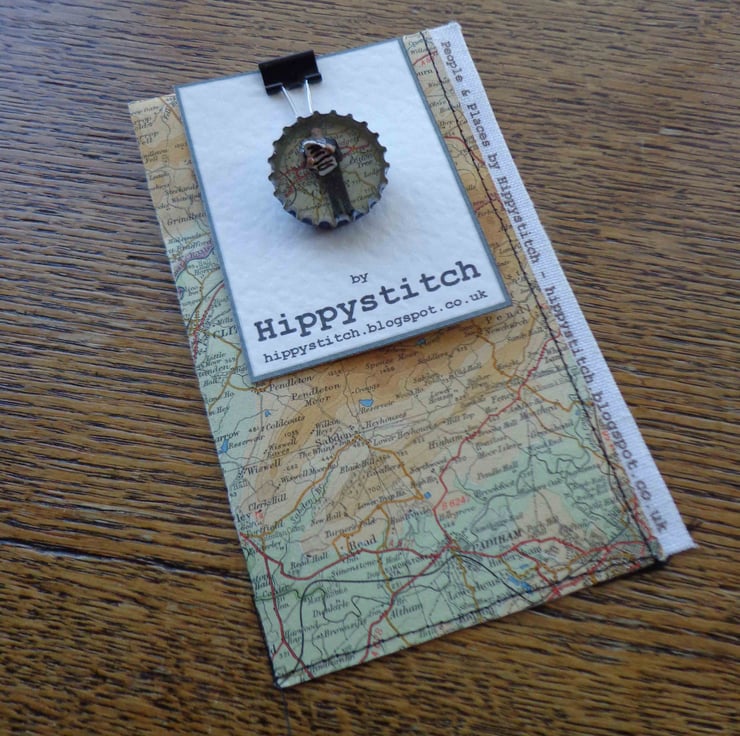 The brooch is approx 3 cm in diameter and is presented on ivory hammered card. It comes with a vintage map pouch, approx 9 cm by 15 cm (closed), with a printed fabric label stitched down the side showing range name and maker details and a bulldog clip. The bulldog clip keeps the brooch and pouch together but when giving as a gift can be used to keep the pouch closed when the brooch is inside. The clip could also be used to hang the item up on a hook or nail.