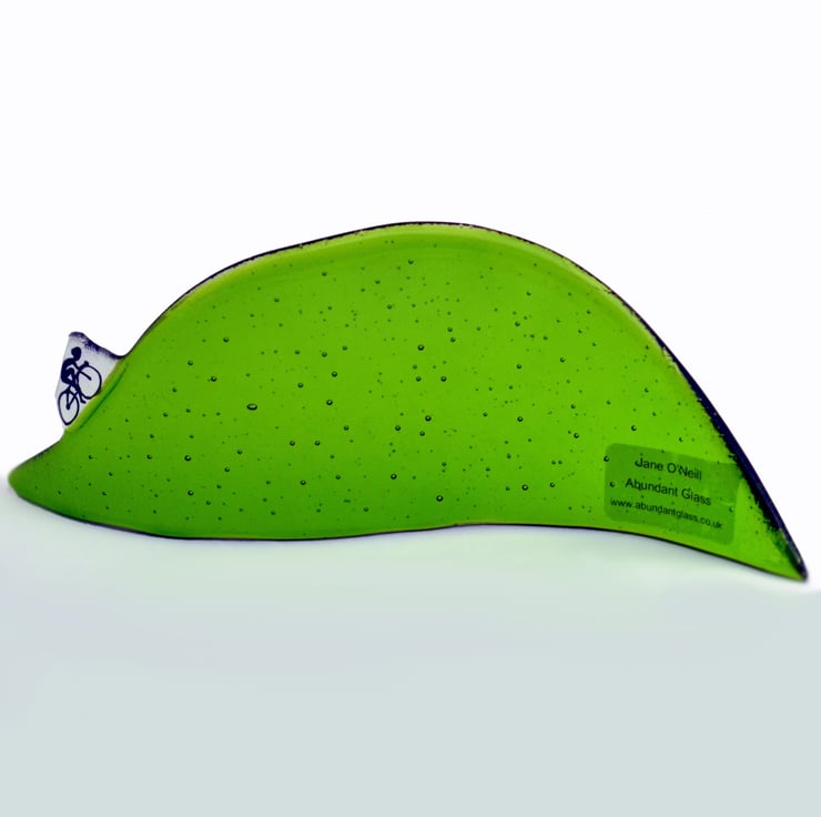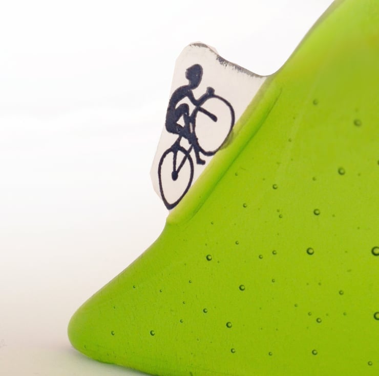 A fun sculpture depicting a lone cyclist cycling up a steep hill. The glass is a gorgeous green and looks lovely standing on its own or with a candle behind. Each one of these sculptures is unique with the shape of the hill and position of the cyclist in different positions.