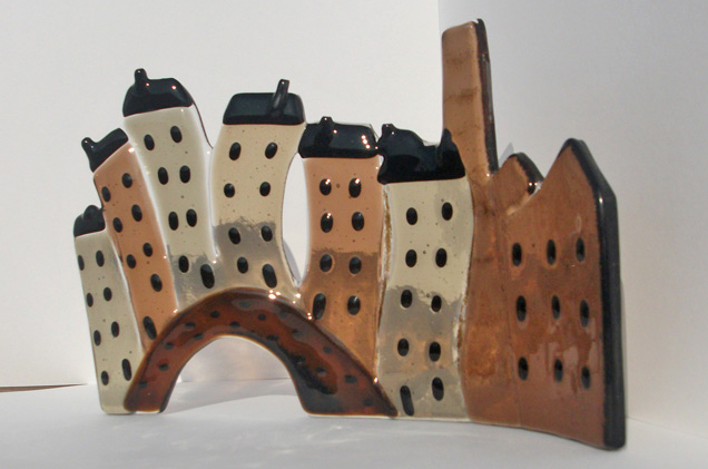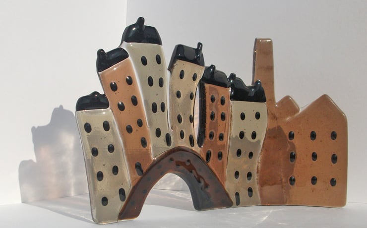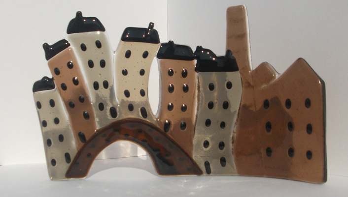 A row of typical top – bottom Pennine houses with a mill and bridge. Inspired by my home town of Hebden Bridge.