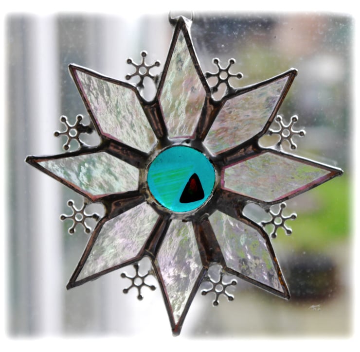 I've designed it with 8 diamond shaped points made from iridescent clear glass and at the centre a gorgeous bright twinkly turquoise glass nugget with lovely dichroic accents which I made in my fusing kiln.