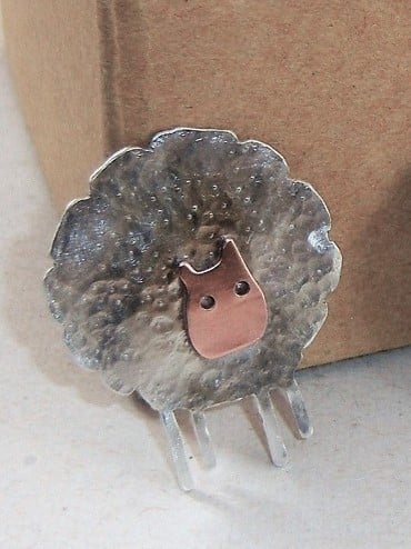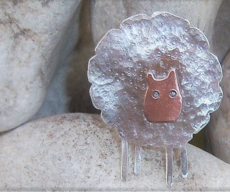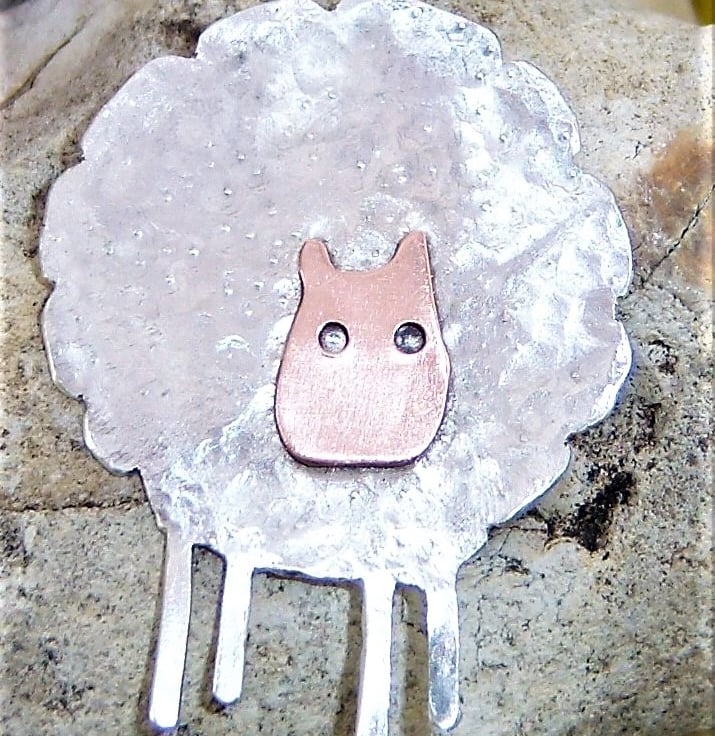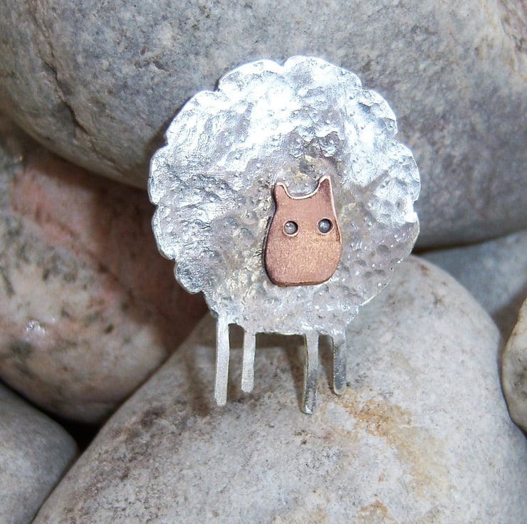 A sheep brooch with a textured sterling silver fleece, legs and fastener and a copper face. She measures approximately 39 x 29mm.