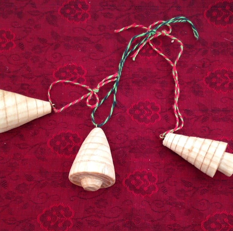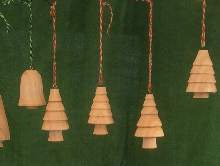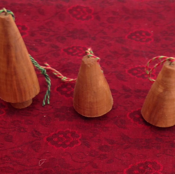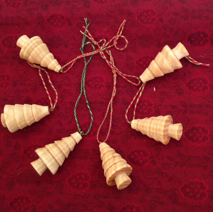 Christmas trees in a variety of styles turned on a pole lathe and finished with walnut oil. The wood is ash grown locally in Herefordshire. Each decoration is completely unique and measures between two and three inches. Please specify which type you are interested in - plain, stepped, shaggy, dark, ringed - or I can send a surpirse selection!