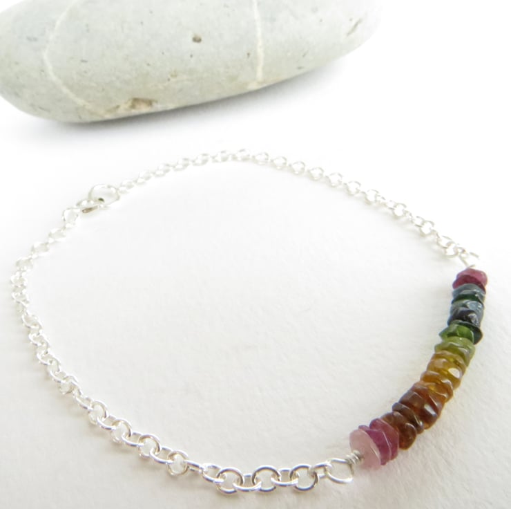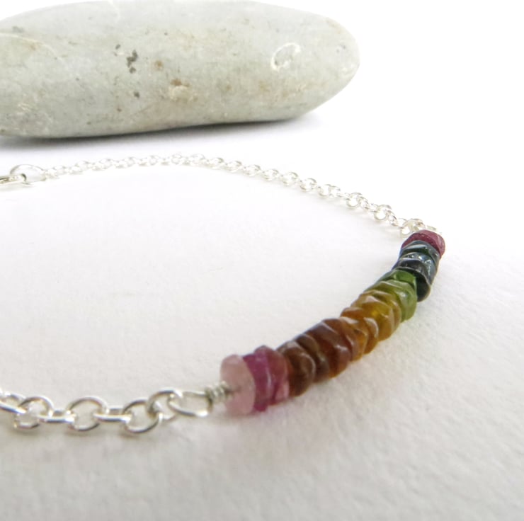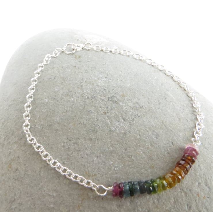 This sterling silver and rainbow tourmaline bracelet features a bright rainbow of tiny hand faceted tourmaline gemstone beads, with a fine sterling silver chain either side. It would make a beautiful gift for any lover of gemstone jewellery, or rainbows! It is also a perfect match for the silver and tourmaline necklace, also available in my shop and shown in the last picture.
