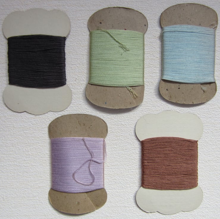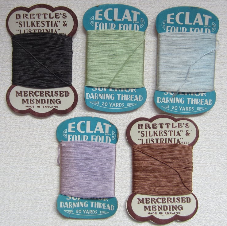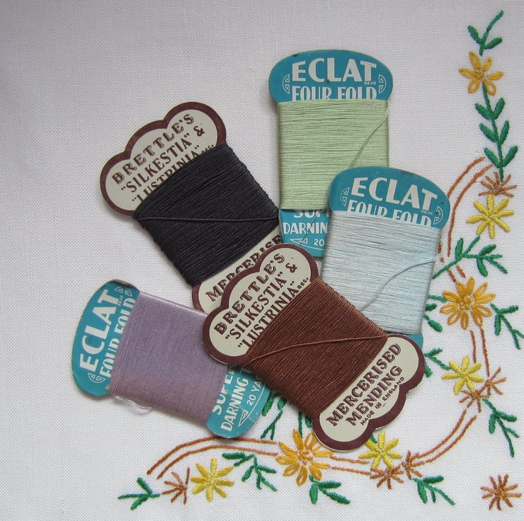 5 cards of vintage darning and mending threads in 5 different colours. Each card measures 8.5 x 5 cm. As these threads are vintage they may be slightly discoloured on the outside and may not be complete.