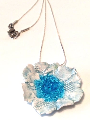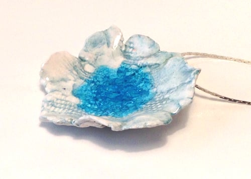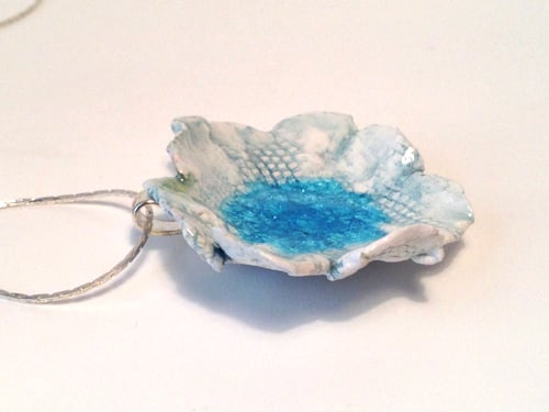 A textural porcelain necklace hand shaped with love and fired twice with sky blue glaze and glass.