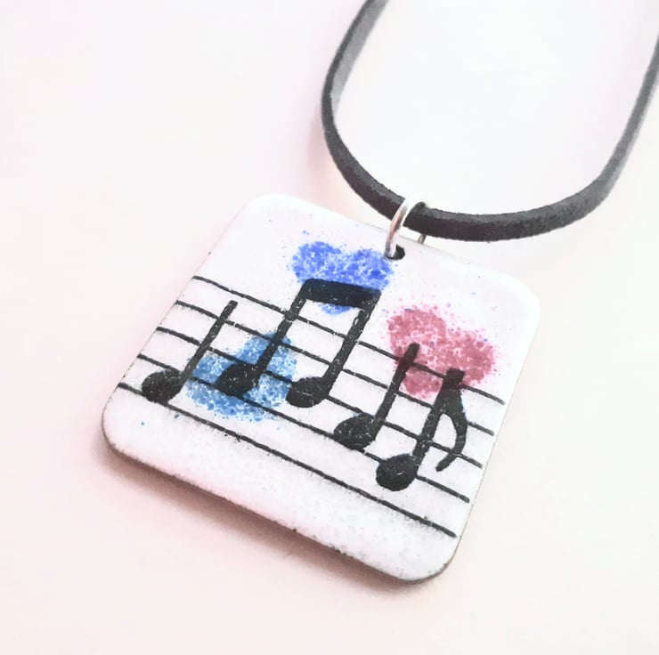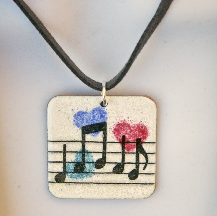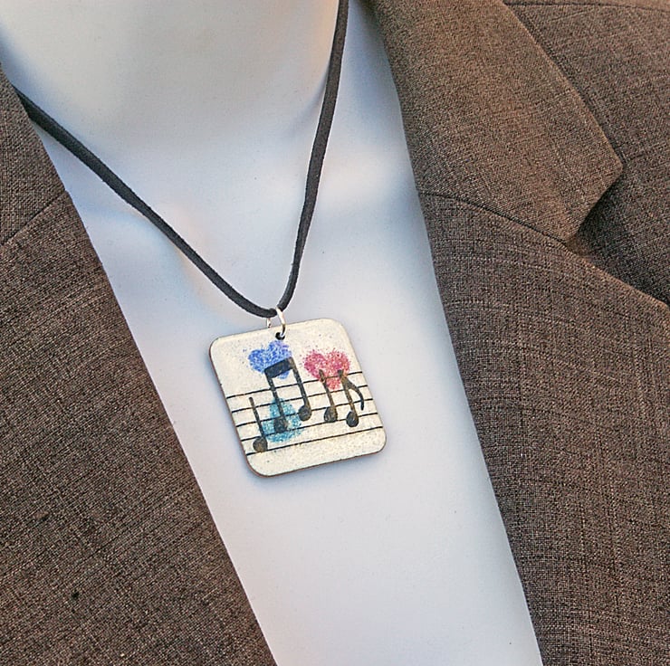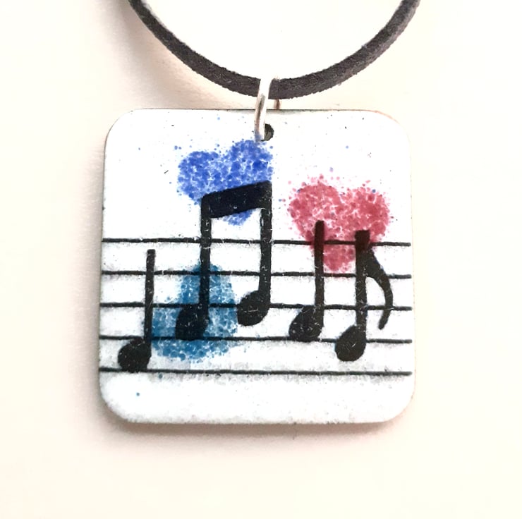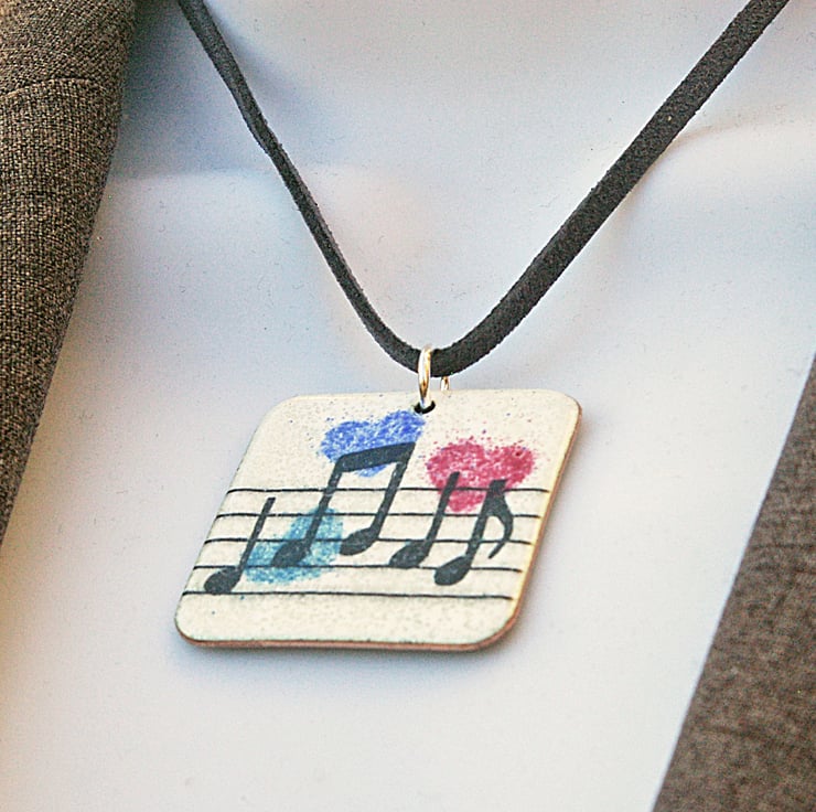 This fun 35mm one-off square enamelled copper pendant has colourful hearts and 'music'on a white & pale grey background. The reverse is also enamelled in a mixed colour. The pendant hangs from an 18" (45cm) dark grey cord with a silver-plated clasp. Quality card gift packaging is provided. The pendant will be sent by royal mail’ Tracked’ service.