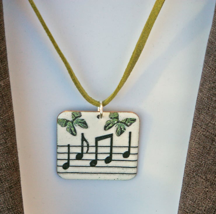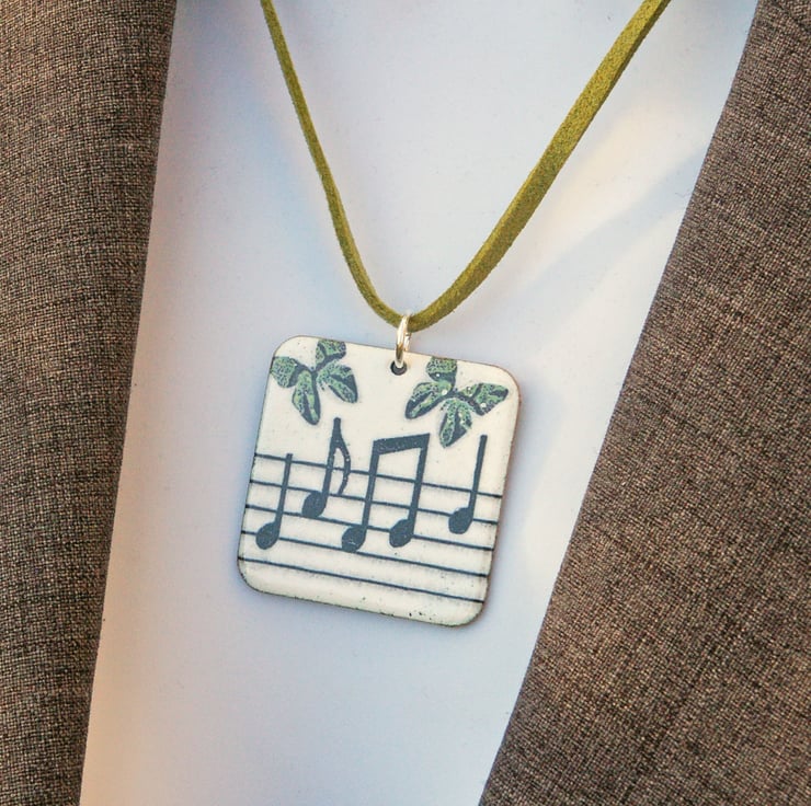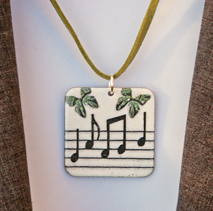 This one-off pendant is around 35mm square and is decorated with a musical design enhanced with butterflies. The background is white with a little pale grey mottling, the 'music' is in black and there are green butterflies. It has an olive green coloured 18" (45cm) cord with a silver-plated fastener. Quality gift packaging is provided. The pendant will be supplied by royal mail 'Tracked’ postage.