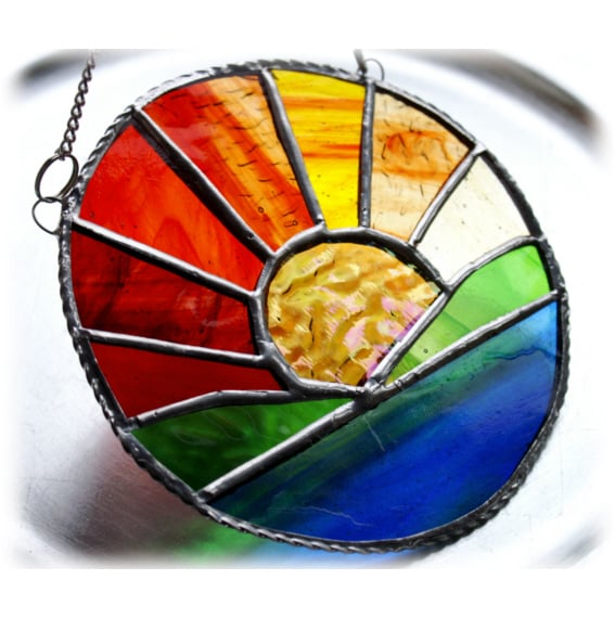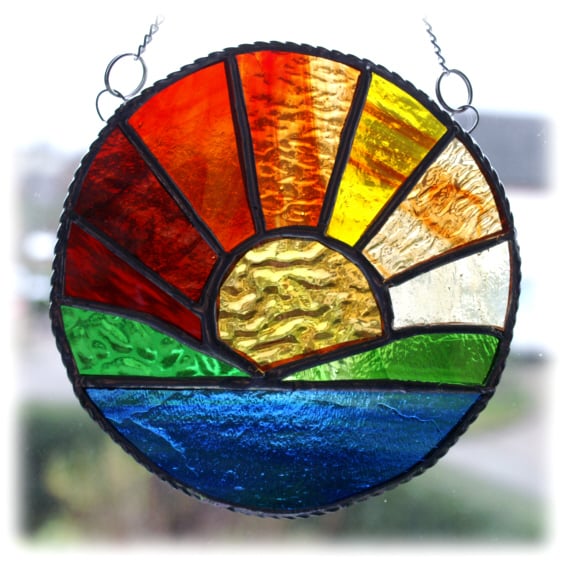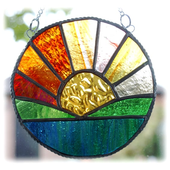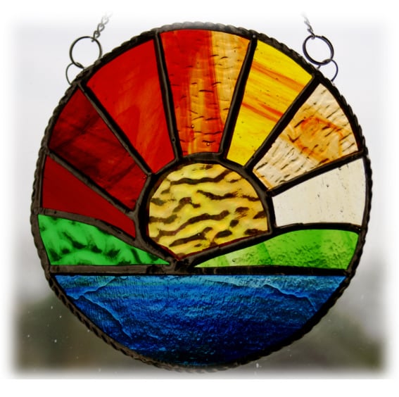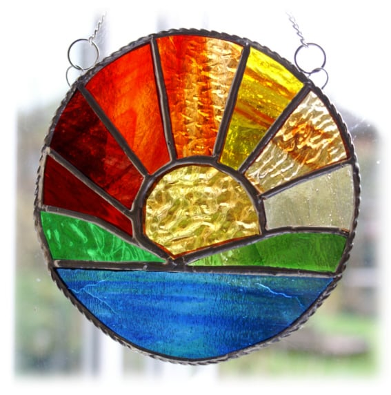 The sun's rays are made from 7 different colours and textures of red, amber and yellow glass with lots of streaks to denote the rays.