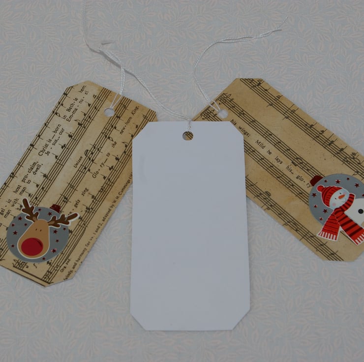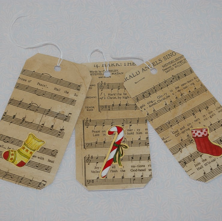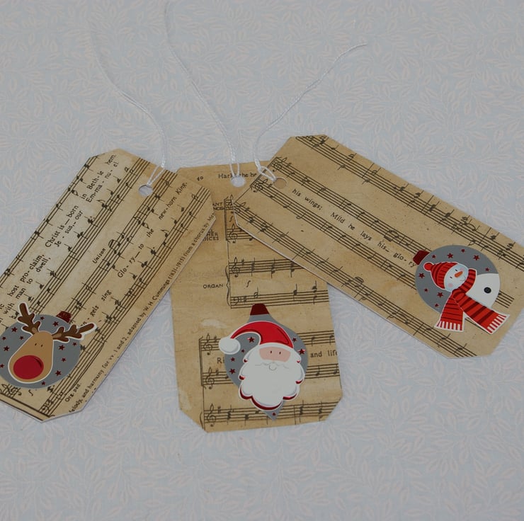 A set of six upcylced, retro styled large Christmas Gift Tags. This great set of tags have been created from good quality white card stock, and recycled Carol music sheet. Each tag is different. The sheet of music has coloured with age and use. It also contained small rips and was dog eared around the edges. So I have careful cut the music sheet to exclude those tears. The stains from the ageing process are not uniform in pattern all over the sheet so each tag will have slight variation in colour. Onto each tag there is a different topper each with a Christmas theme.