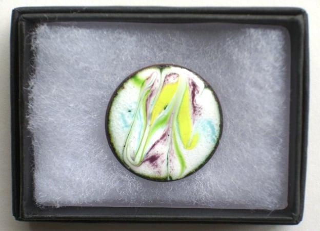 This scrolled glass enamel brooch has a patterning made by drawing a steel tip through the enamel while it is in the kiln at red hot; it has been counter-enamelled to balance the expansion and contraction of the worked surface through numerous firings; the brooch bar is 20mm with a rotating lock, soldered to the piece.