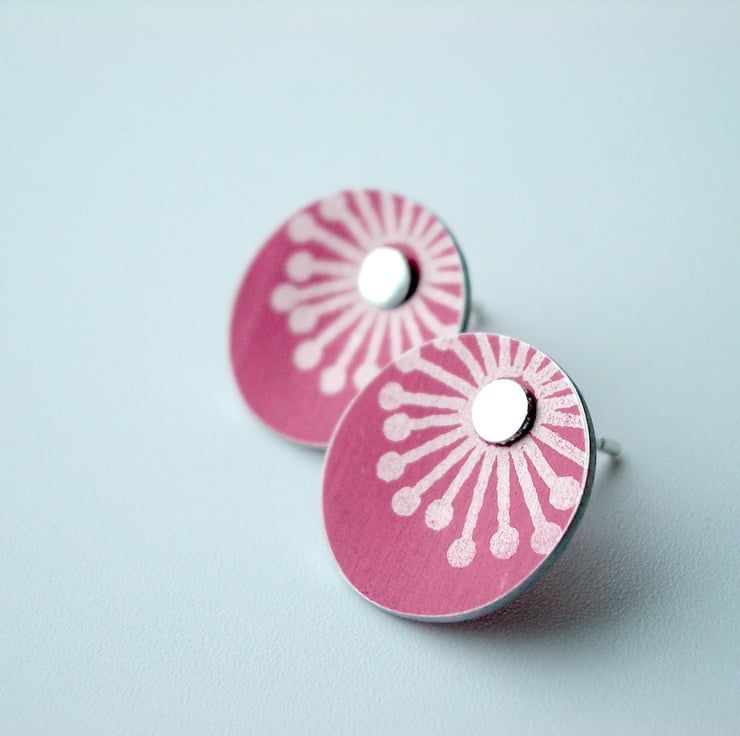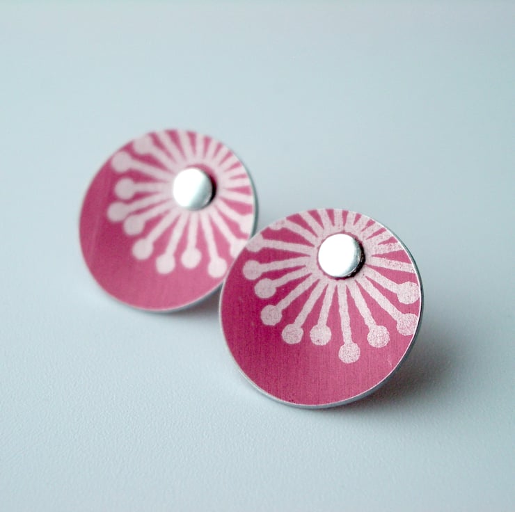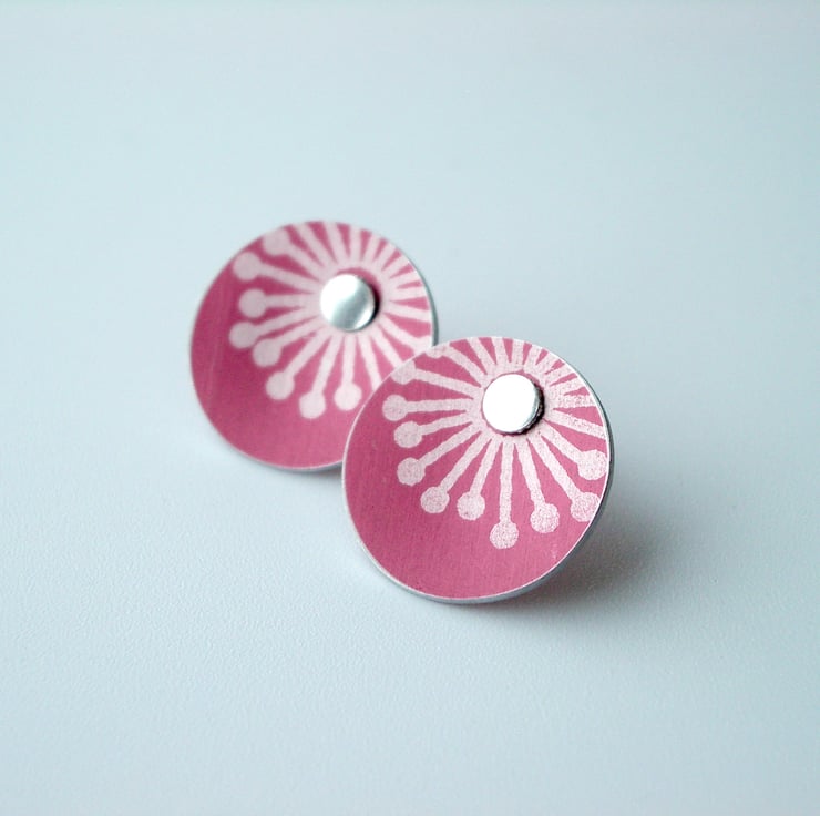 These sweet little studs are made from aluminium which I have dyed burgundy and printed with a starburst design. I seal in the dye so that it becomes a permanent part of the metal and saw pierce the disc shape by hand, filing and smoothing the edges to give a nice finish. Finally I've drilled holes for the sterling silver studs to feed through and domed the discs inwards so that they catch the light. It's not possible to solder