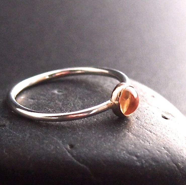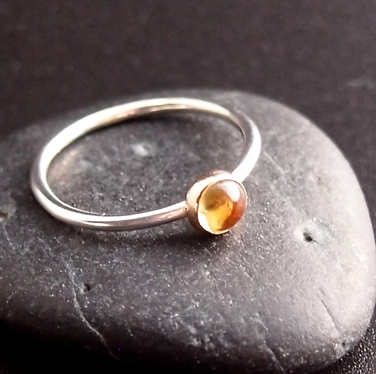 A golden yellow citrine is simply bezel set onto a plain sterling silver ring 1.5 mm thick . The cabochon is 5mm across.