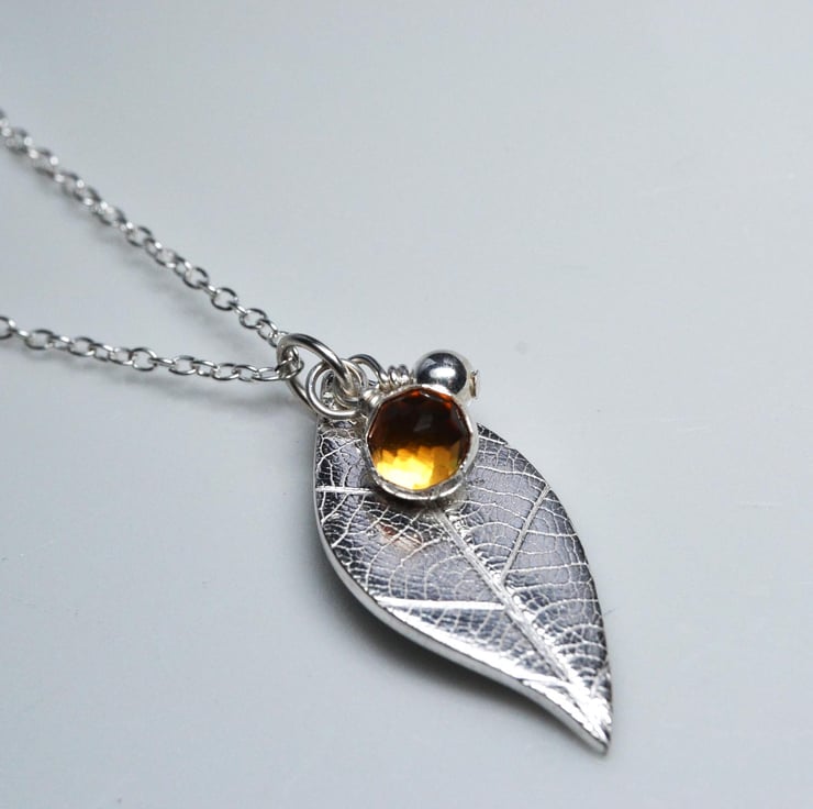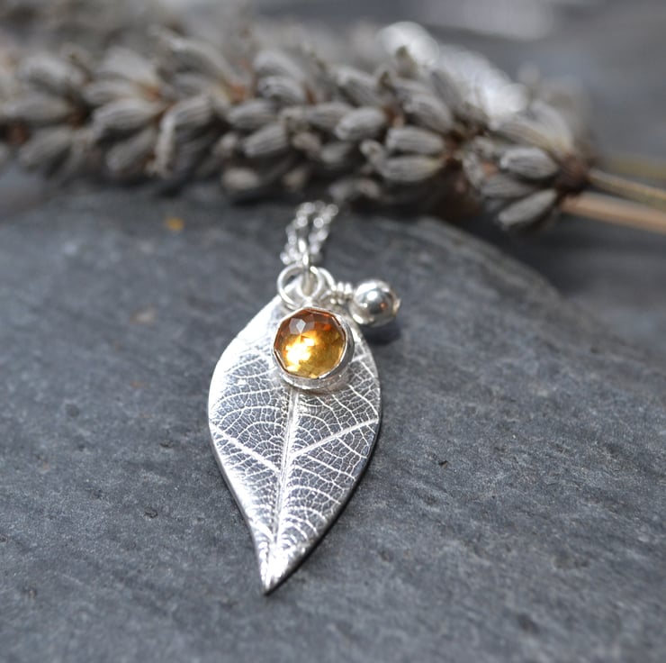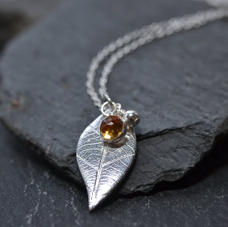 This handmade fine silver leaf is teamed with a citrine rose cut cabochon, and a dinky sterling silver bead. They all hang from an 18" trace chain.