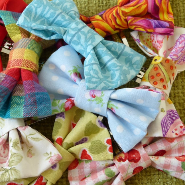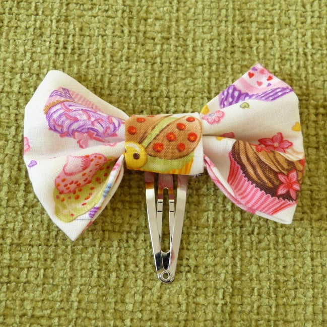 A lovely hair clip made from soft cotton fabric, folded to give several layers and more body to the bow.