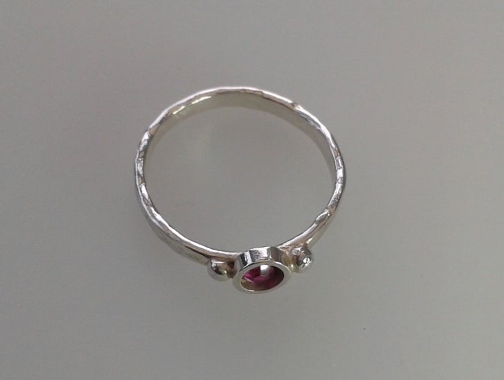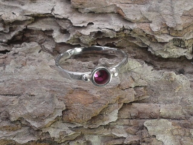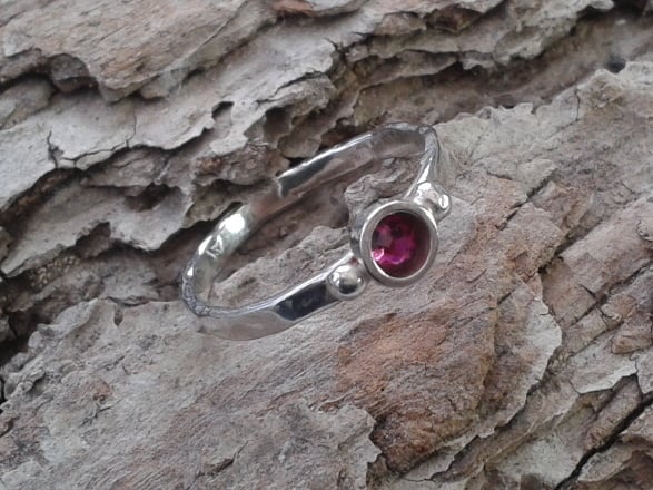 This pretty ring has been made from 2mm silver wire which was beaten with a ball-pein hammer to create reflective texture. I soldered a silver tube setting in place to house a 4mm wide Swarovski crystal in fuchsia pink. The setting is decorated with silver granulations on either side and the whole ring has been tumble-polished to make it shine. The size I have in stock is UK size Q.