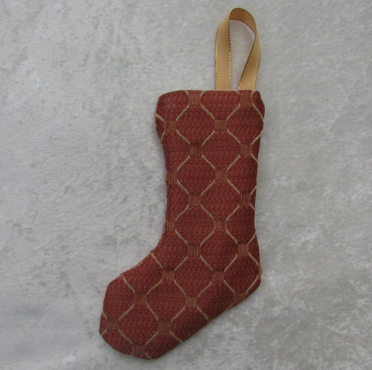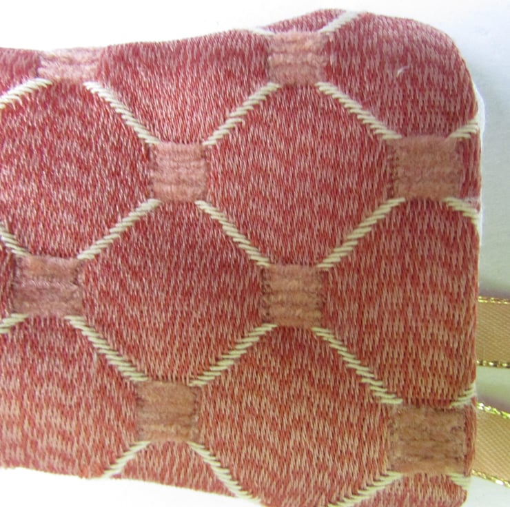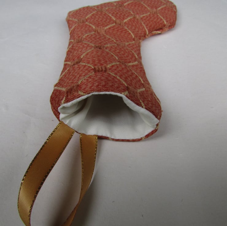 Terracotta fabric with a woven cream diamond pattern. Fully lined with cream fabric. Gold sparkle-edged hanging ribbon.