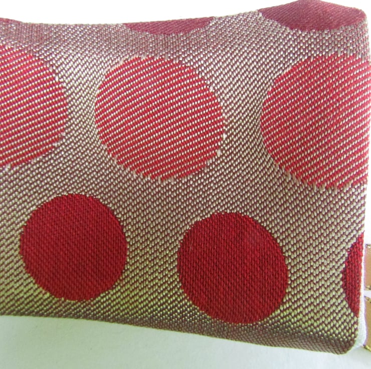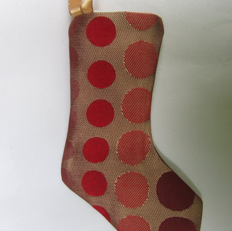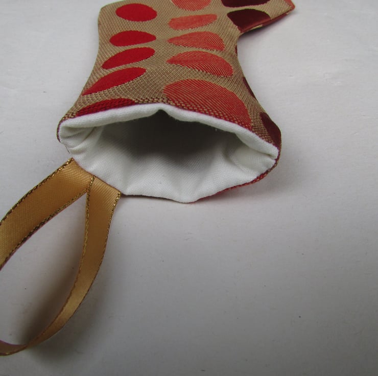 Small Christmas stocking in gold fabric with terracotta, red and brown circles. Fully lined with cream fabric. Gold sparkle-edged hanging ribbon.