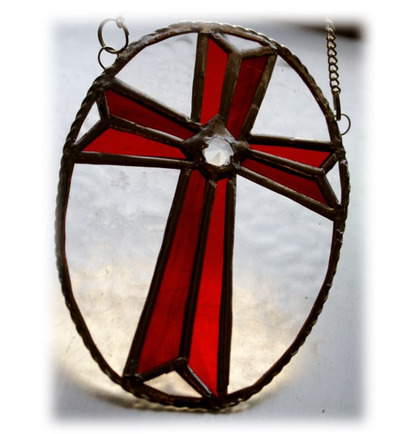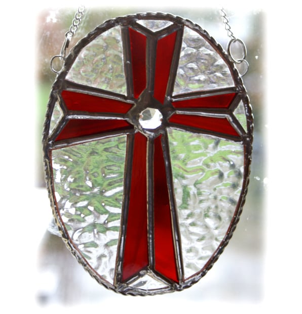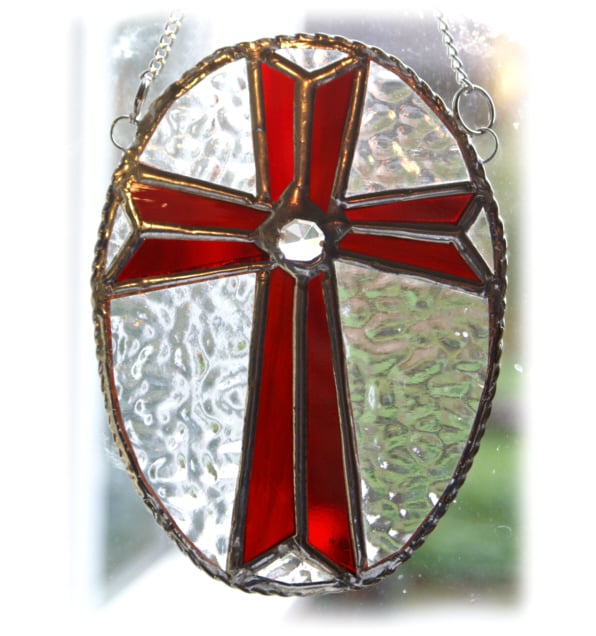 The cross is made from two different shades and types of red glass. The surrounding clear glass is prettily textured clear glass and there is a crystal in the centre.
