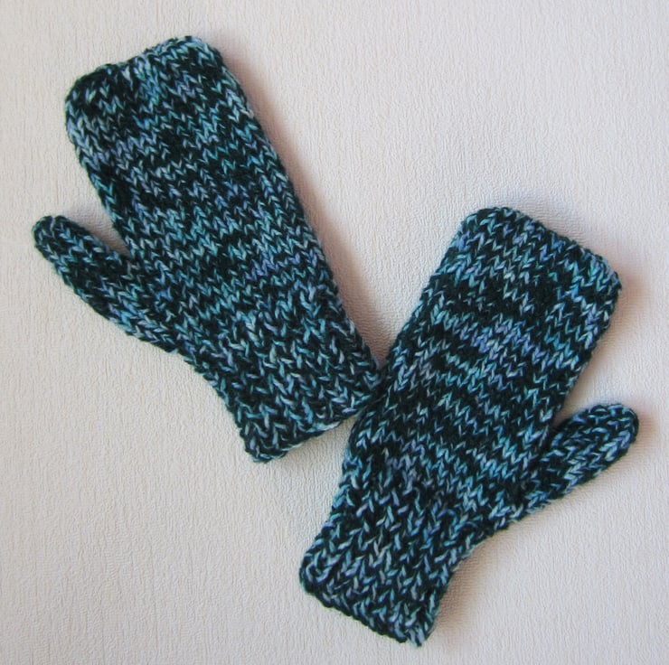 Multi coloured mittens in dark green, light green and light blue, suitable for a child aged about 2 to 3 years old. They measure 14 5 cm long and 6.5 cm (un-stretched) wide.