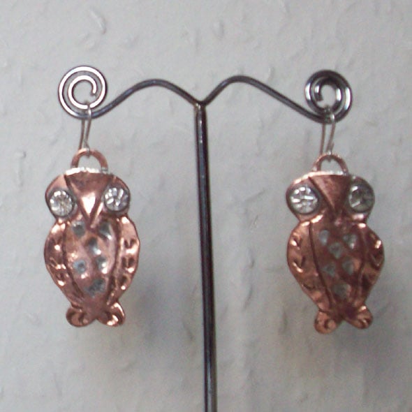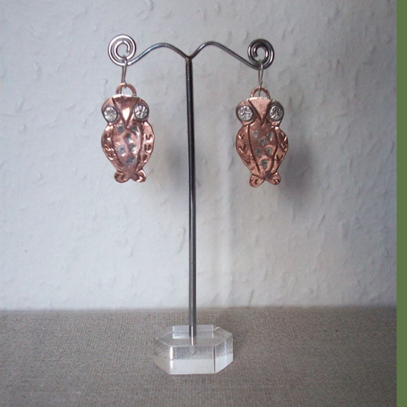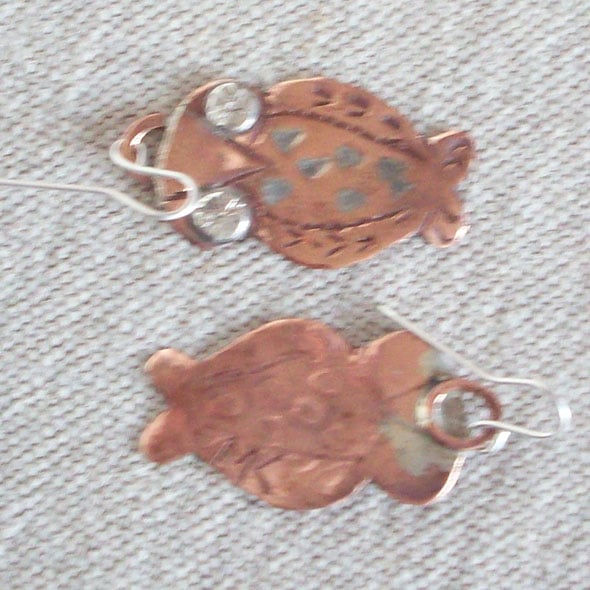 These little owls in copper have eyes in sterling silver. They are decorated with my own hand-made stamps. On the breast they have a feather effect laid in with silver solder. The ear wires are in sterling silver. Comes to you in an organza bag. I always use Special Delivery for the insurance cover. For non-UK and multiple items please contact me as prices vary. Thanks for looking and for supporting hand made!