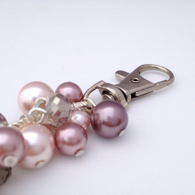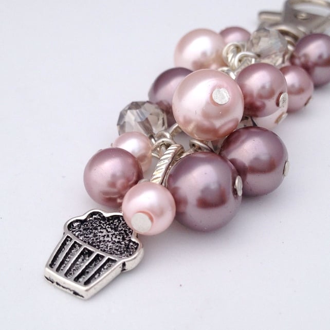This charm has been made using a selection of glass pearls ranging in size from 6mm to 10mm with a few 5x7mm glass faceted beads for a little bit of extra sparkle. All have been attached to a 2inch length of chain using headpins. At the bottom hangs a silver plated cupcake charm that is half an inch long.