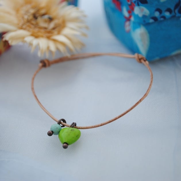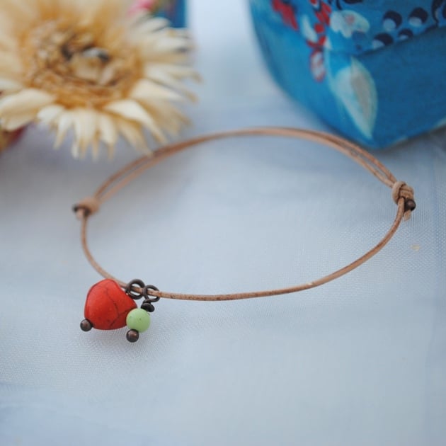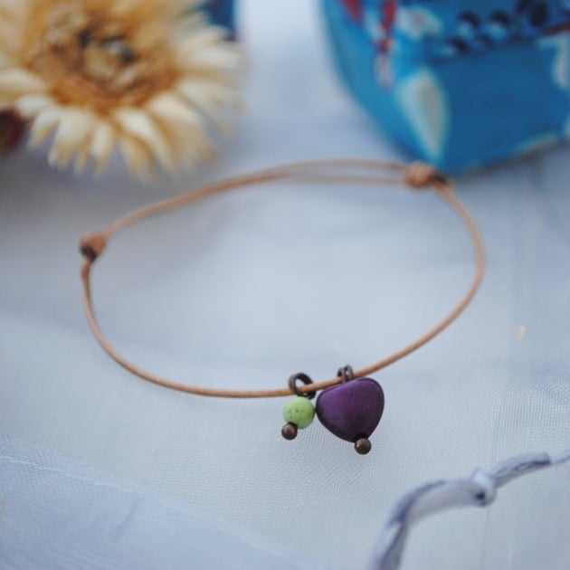A simple friendship bracelets made with natural leather with a howlite heart charm in fuchsia with a contrasting turquoise howlite bead.