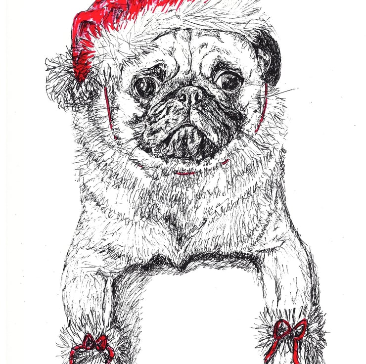 Love dogs? Love christmas? Share the love by giving friends and family this unique card this festive season. Printed from an original Ink Pen drawing by Kelly Stanley, this card features Bilbo the Pug not looking too happy in his christmas get up!