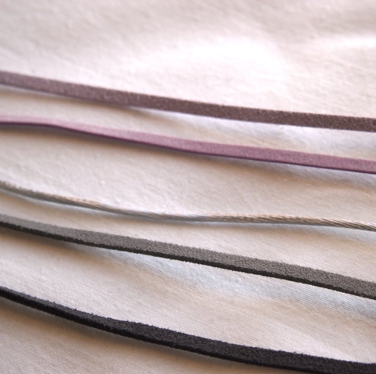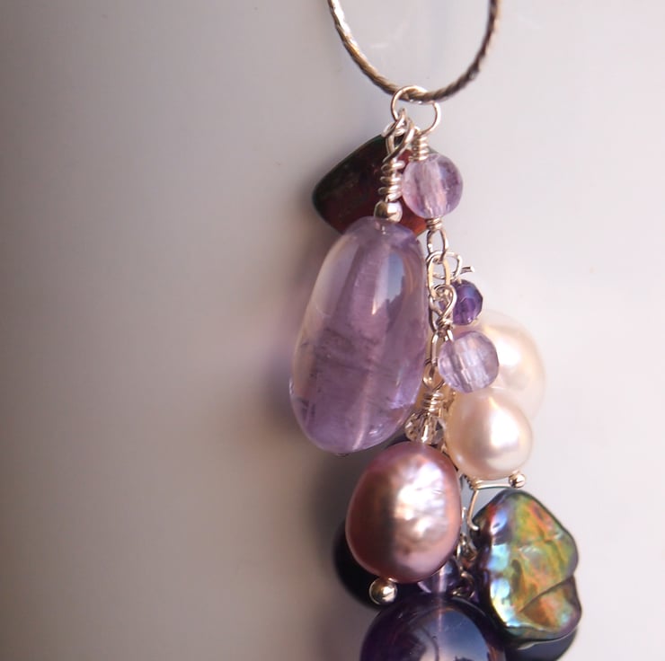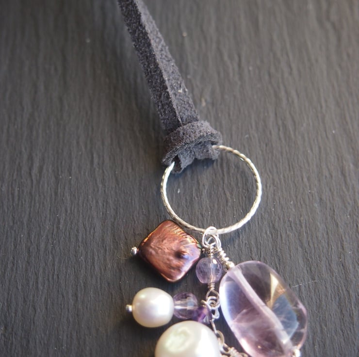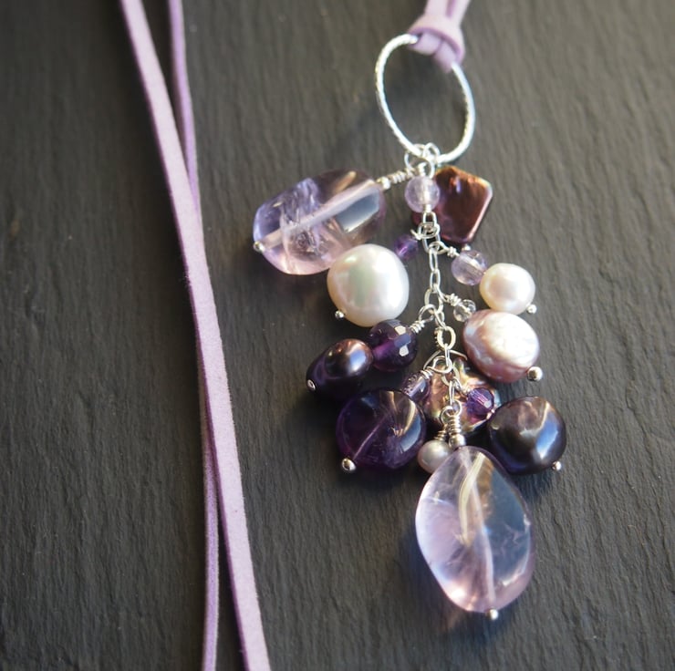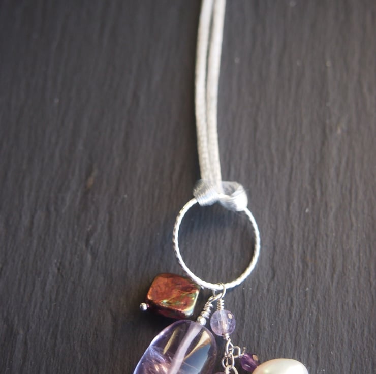 The pendant is 7cm long (including the silver ring) and options for hanging the pendant include two shades of lavender/lilac, or two shades of grey thong of 90cm in length, or a silver silk cord - all of which will be finished at the ends with silver end caps and small pearls or amethyst detail.