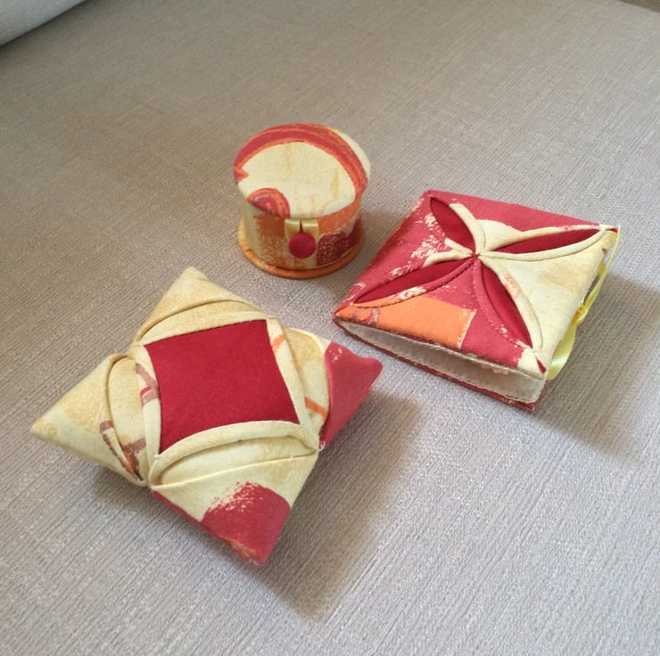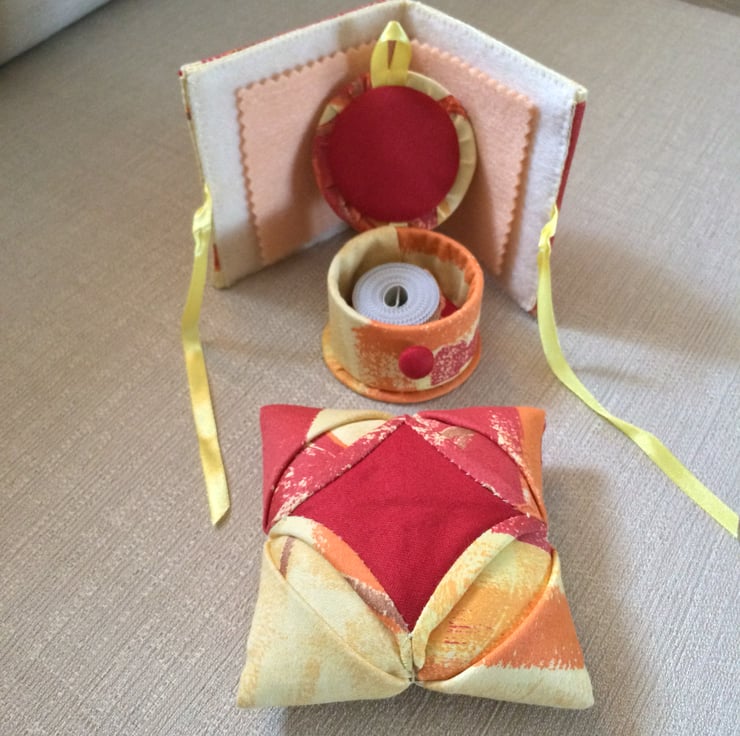 This set comprises a sewing needle book, a pincushion and a small round box containing a tape measure. The pincushion has been made using the "cathedral window" patchwork method on both sides. The needle book has also been made using the secret garden variation of cathedral window patchwork. The inside is lined with cream felt and the leaves are in peach felt. The book has a yellow double ribbon closure. The tape measure is contained in a small round fabric covered box with a lid and a loop and covered button closure.